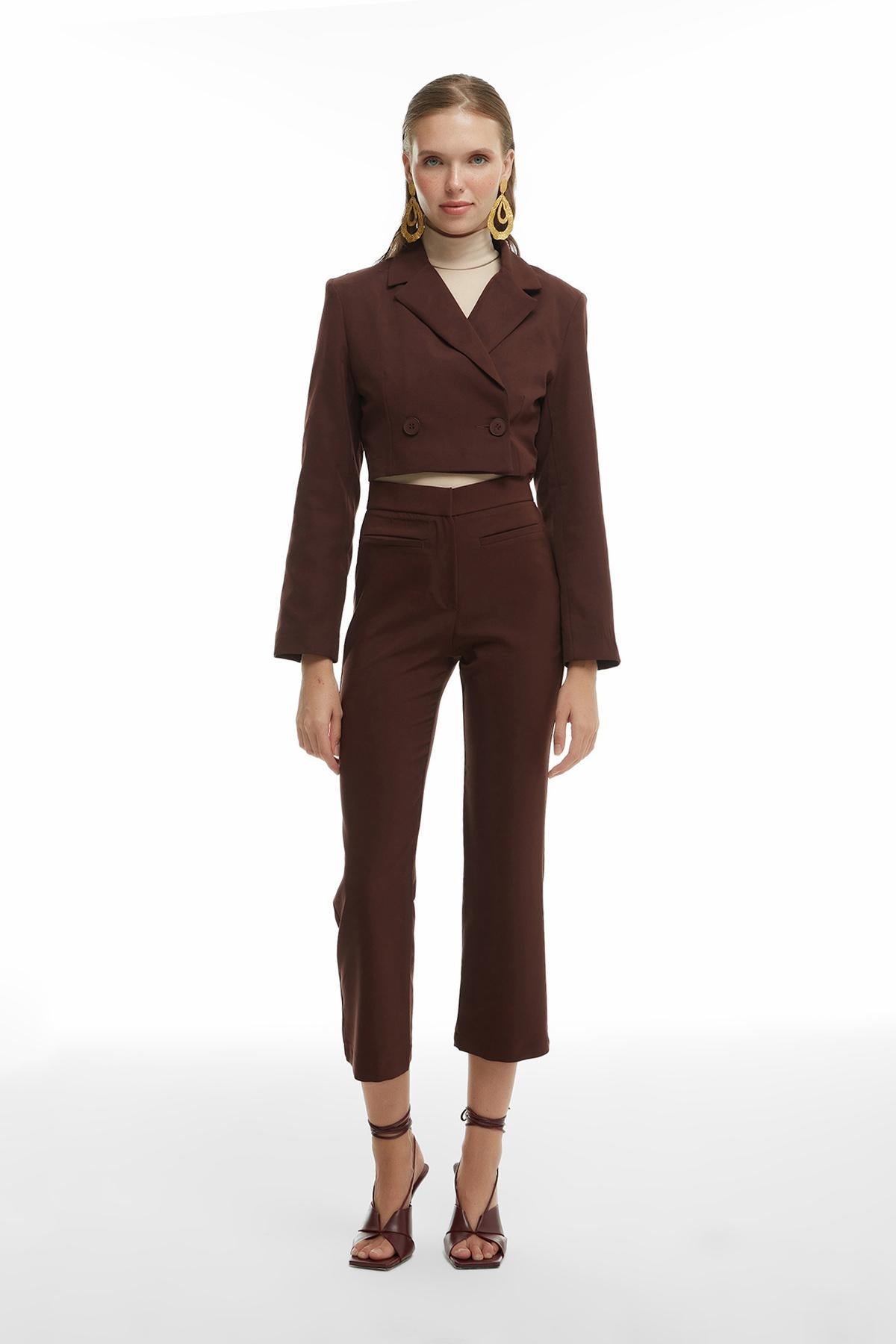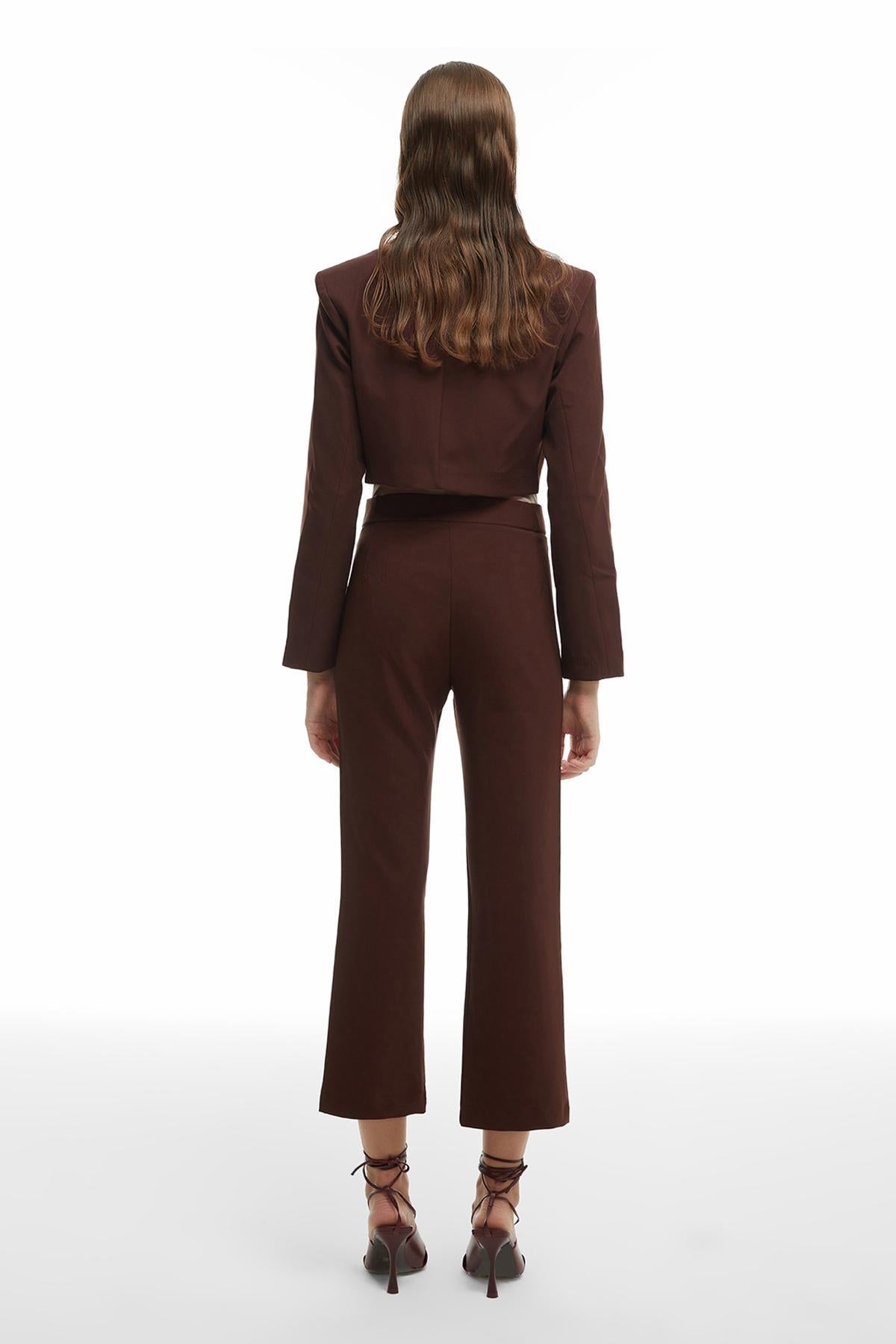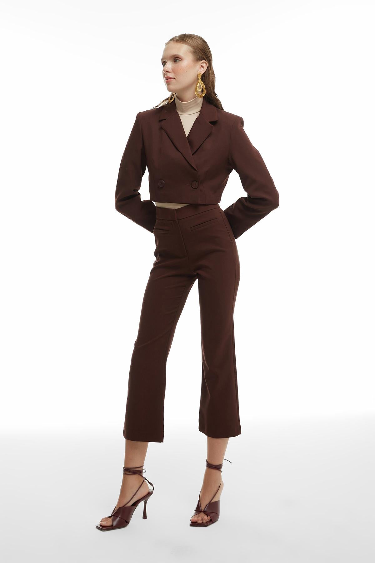 Vücudu saran kesİm, yüksek bel, ön kısmı gİzlİ İkİ ceplİ, fermuarlı, boru paça kumaş pantolon.