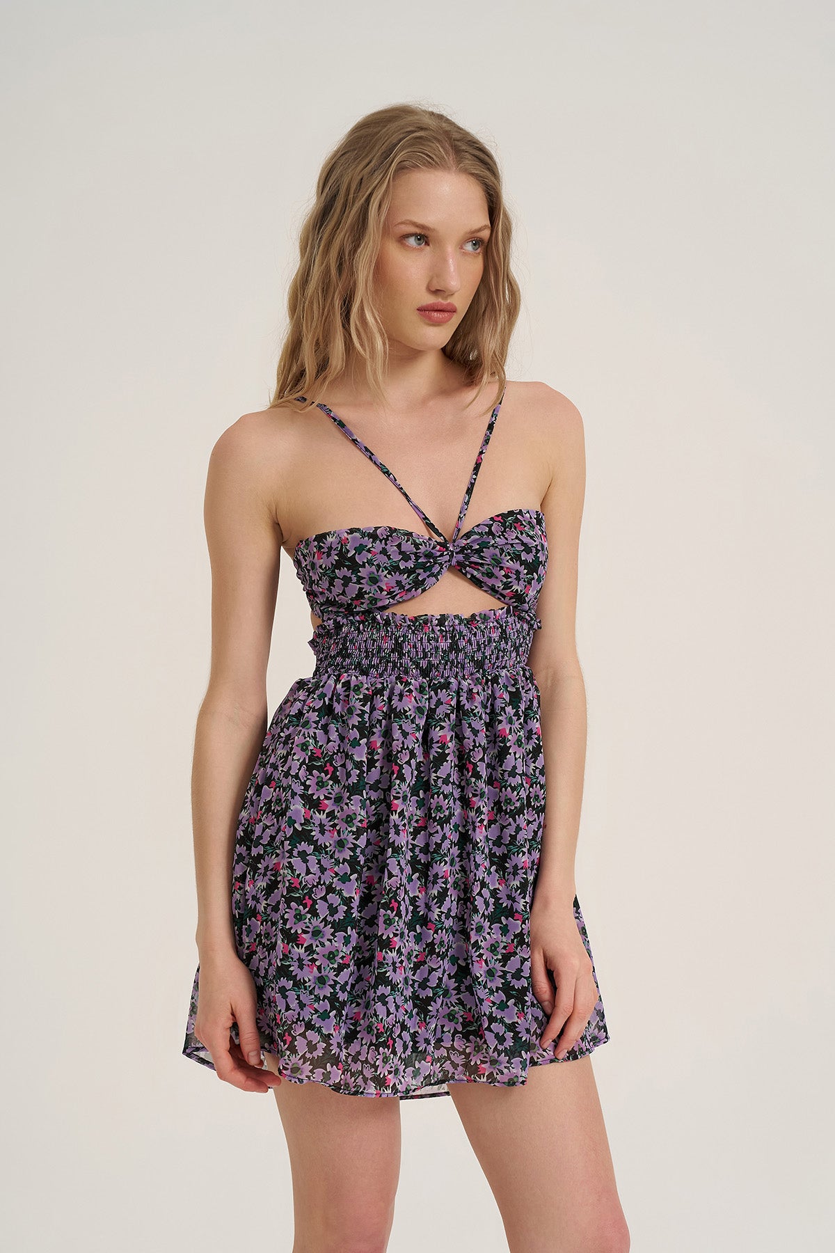 Boyundan Bağlamalı Çiçekli Mini Elbise Mor
