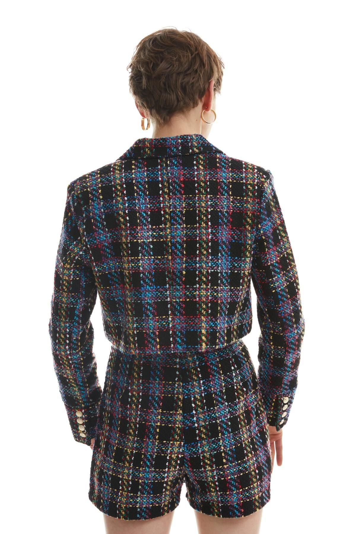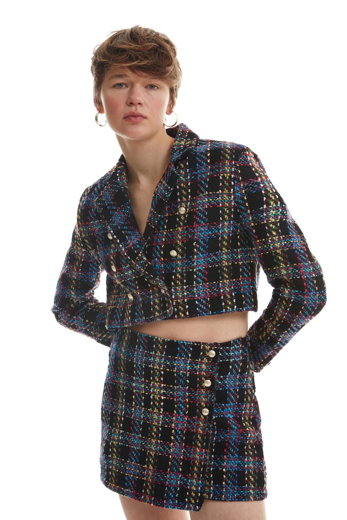 Pamuk içerikli, yüksek bel, düğme detaylı, mini, tüvit şort etek.