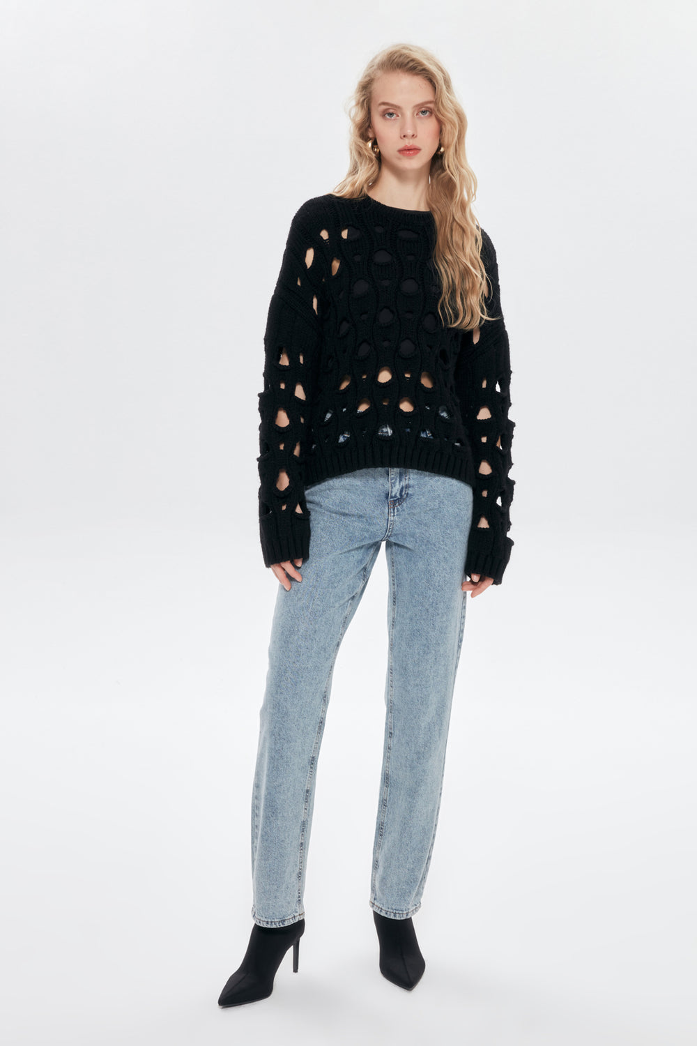 Bisiklet yaka, oversize, uzun kollu, büyük delikli, triko kazak.