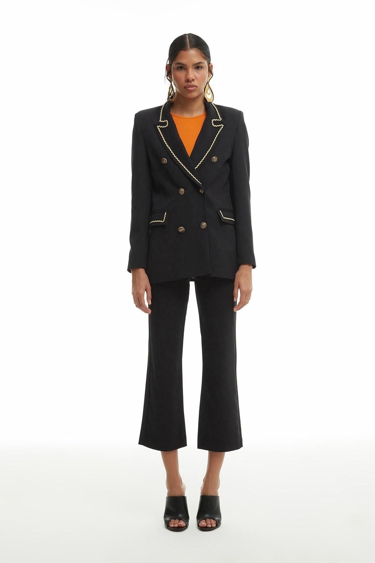 Yaka ve cepleri nakış işleme detaylı, iki cepli, slim fit, içi kendi renginden astarlı, gold düğmeli, kruvaze yaka blazer ceket.