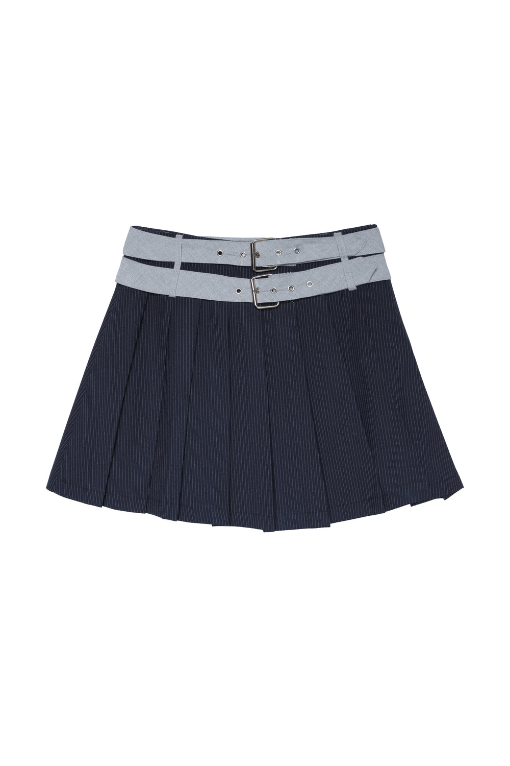 İnce çizgili, çift tokalı kemer detaylı, pileli mini etek.