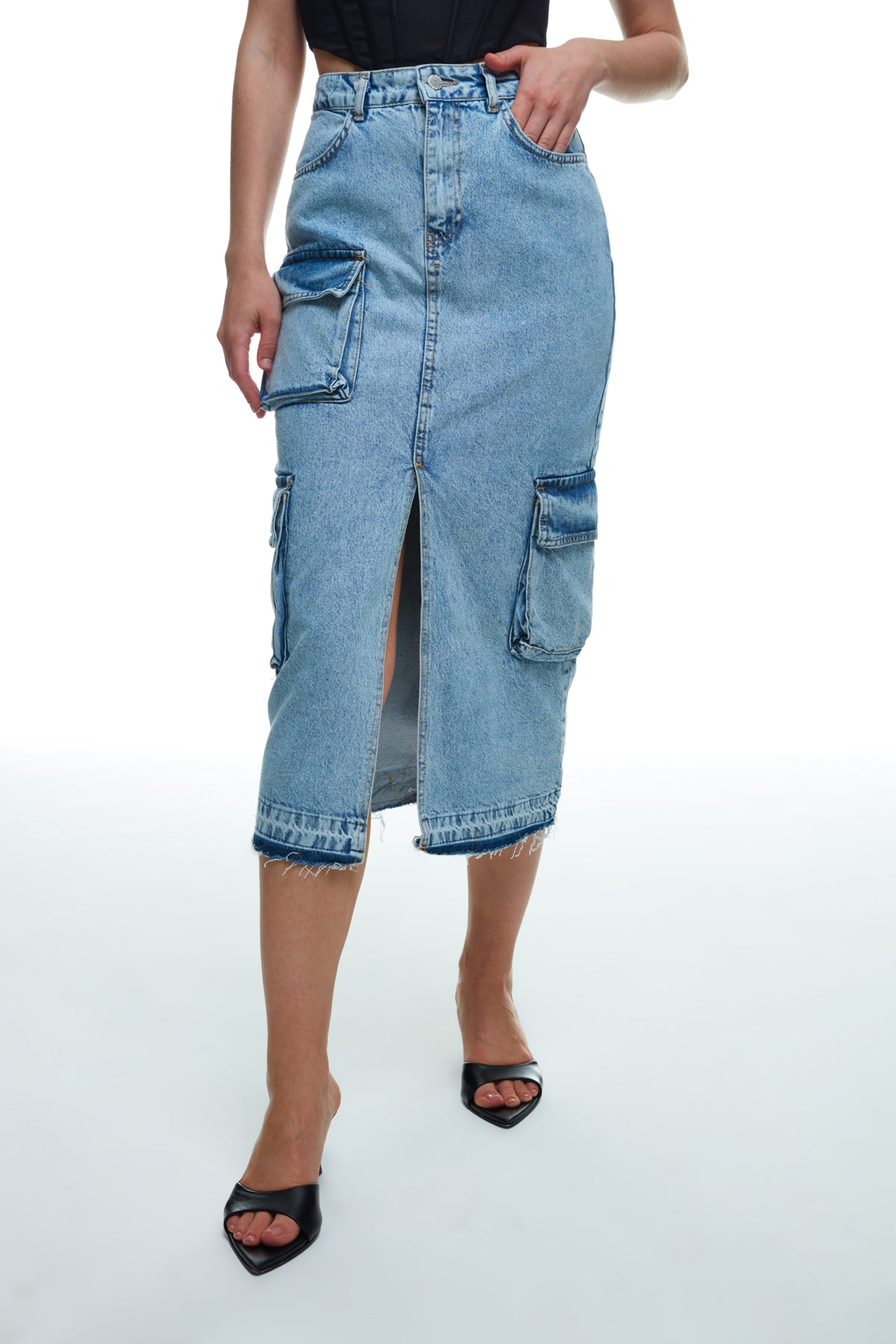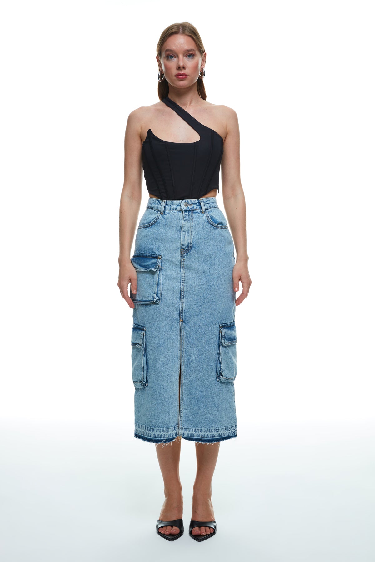 Yüksek bel, kargo cepli, önden yırtmaçlı, ucu kesik detaylı, midi boy, kot etek.