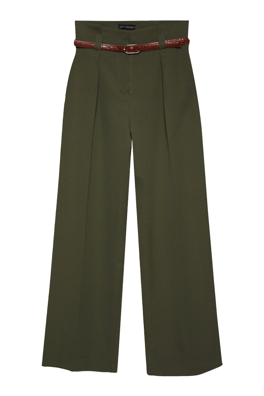 Kemer Detaylı Yüksek Bel Geniş Paça Pantolon Haki