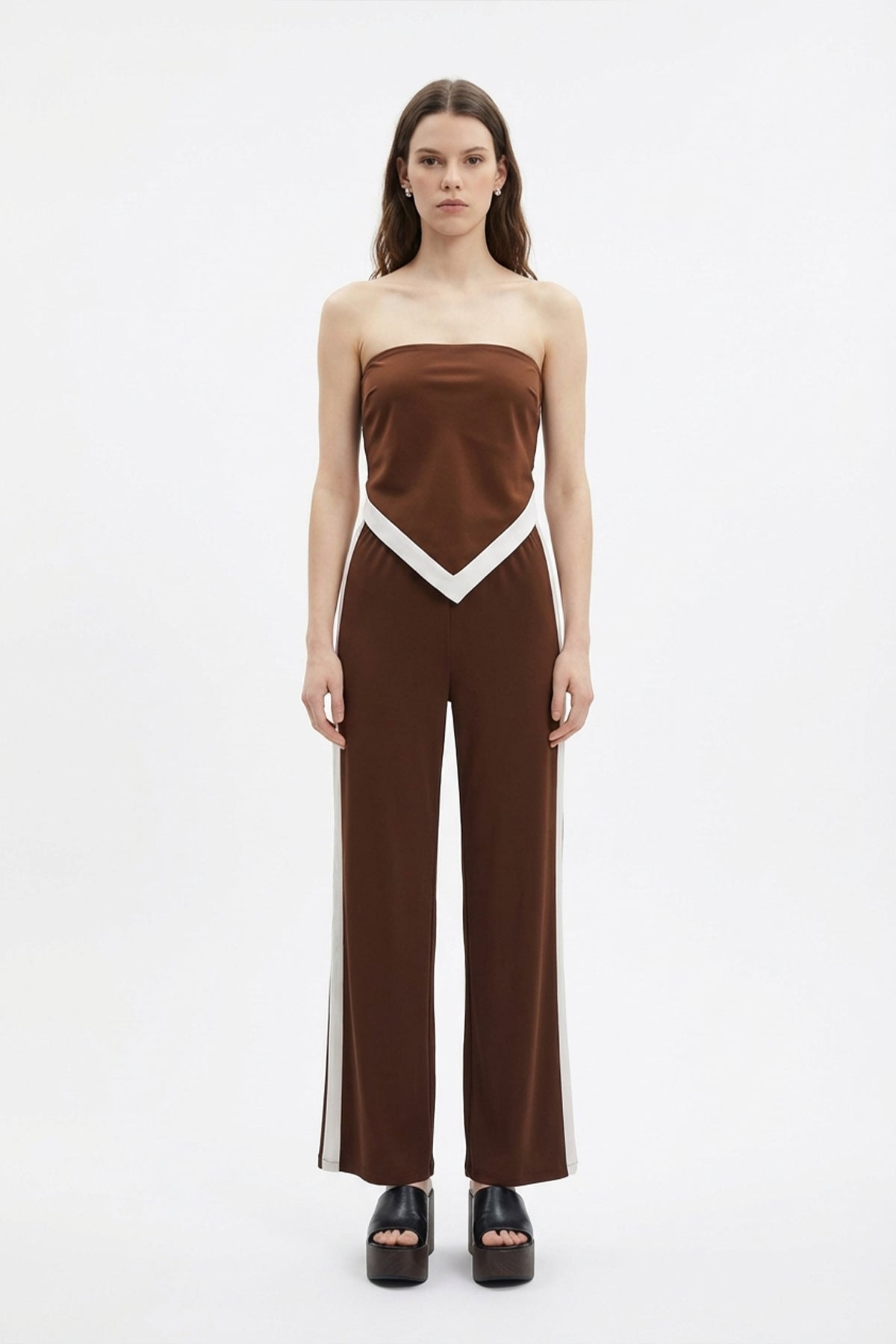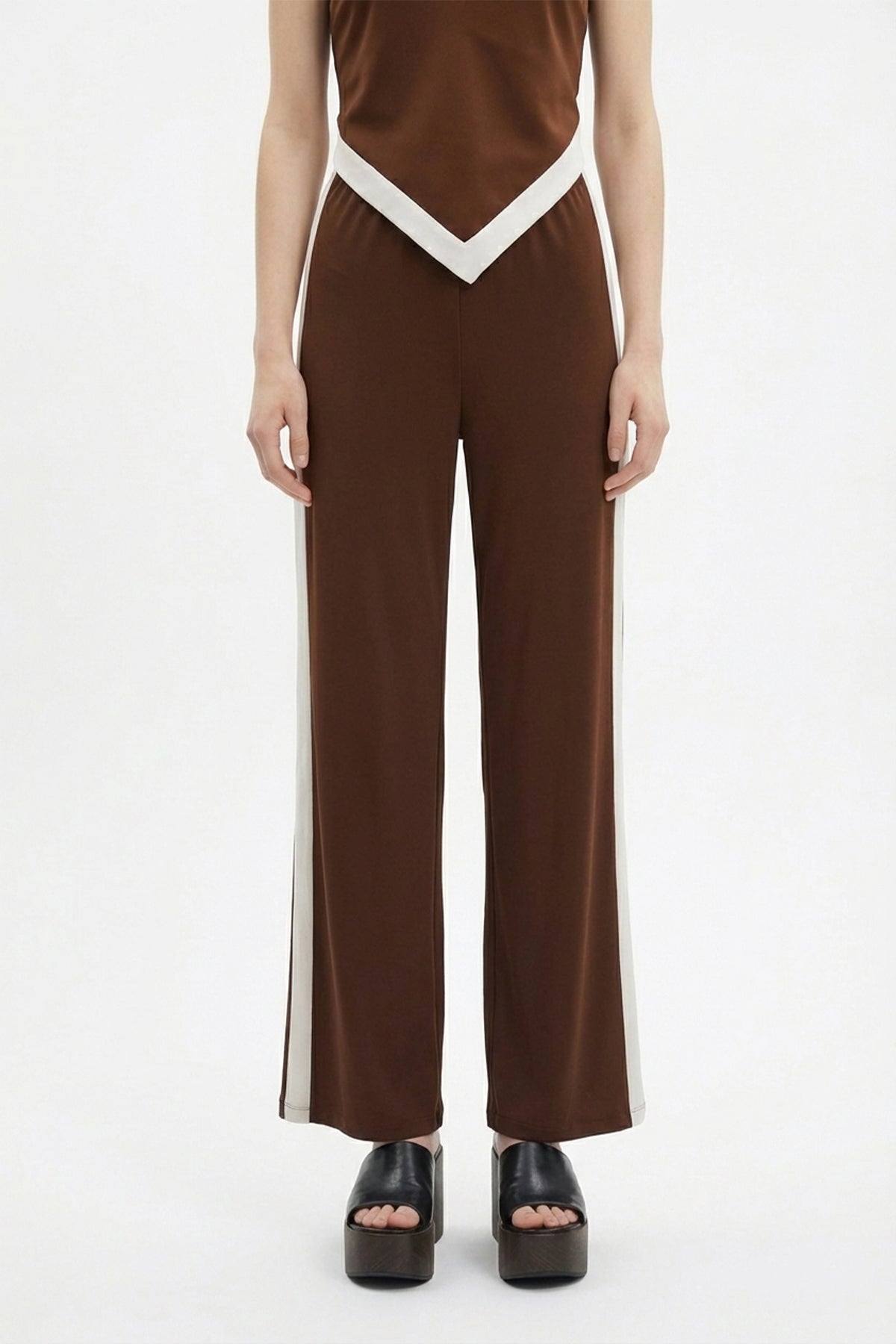 Kontrast Yan Şeritli Bol Paça Pantolon Kahverengi