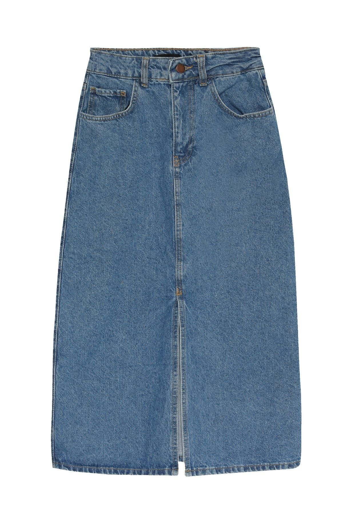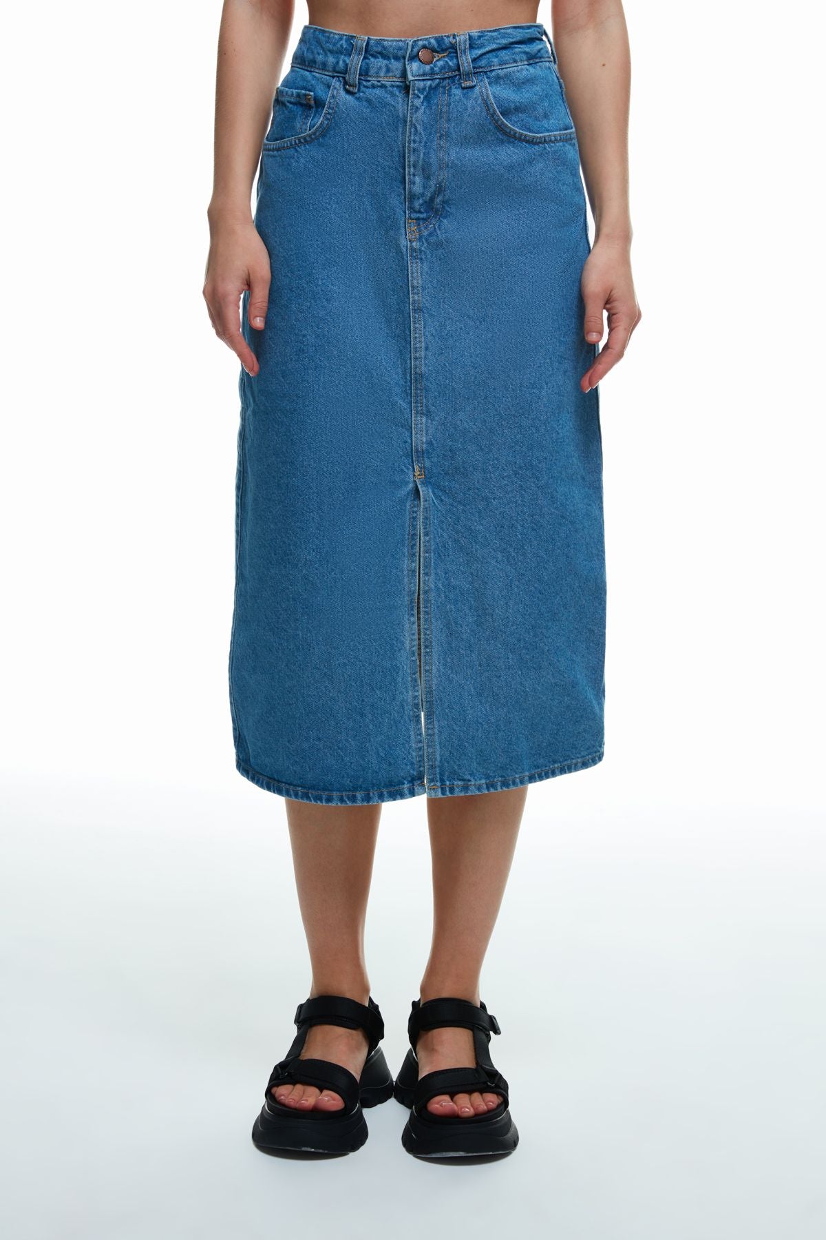Önden Yırtmaçlı Midi Boy Kot Etek Mavi