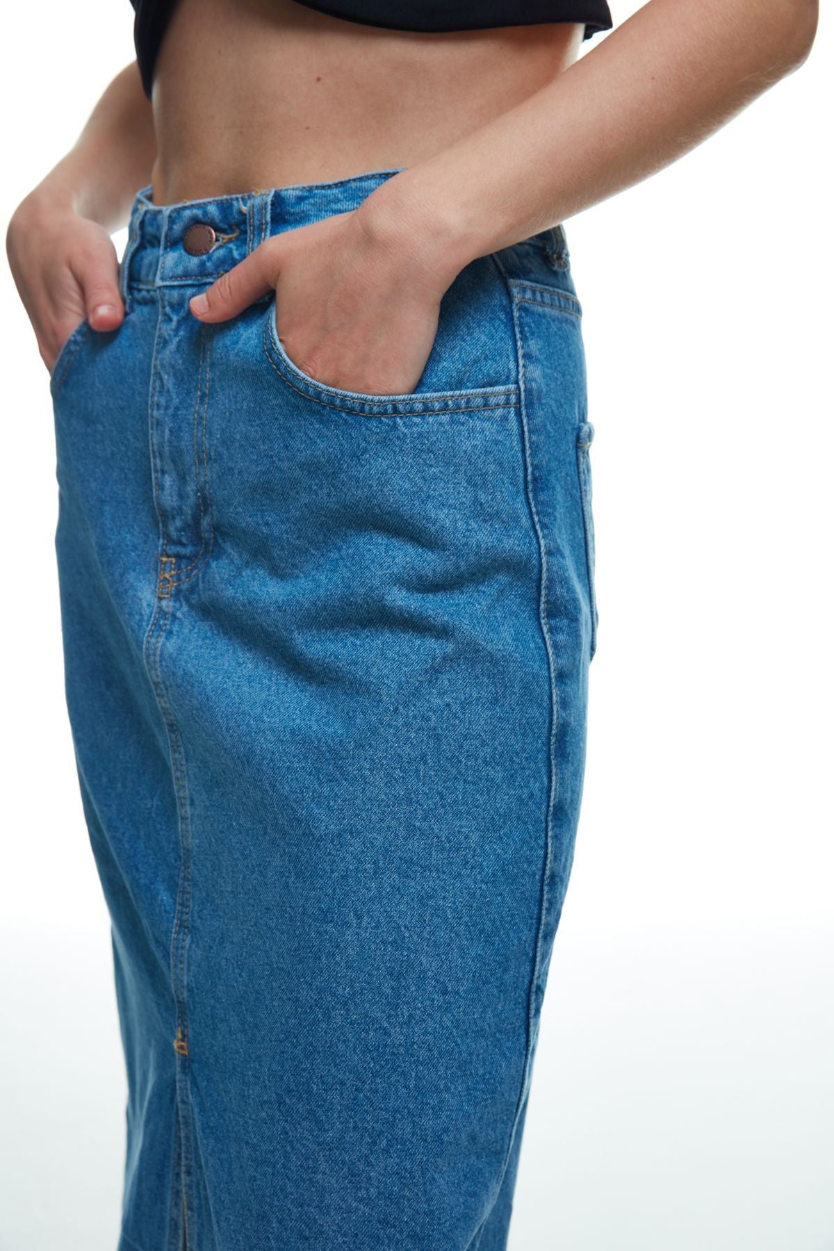 %100 Pamuklu, önden yırtmaçlı, yüksek bel, ön ve arka çift cepli, midi boy, kot etek.