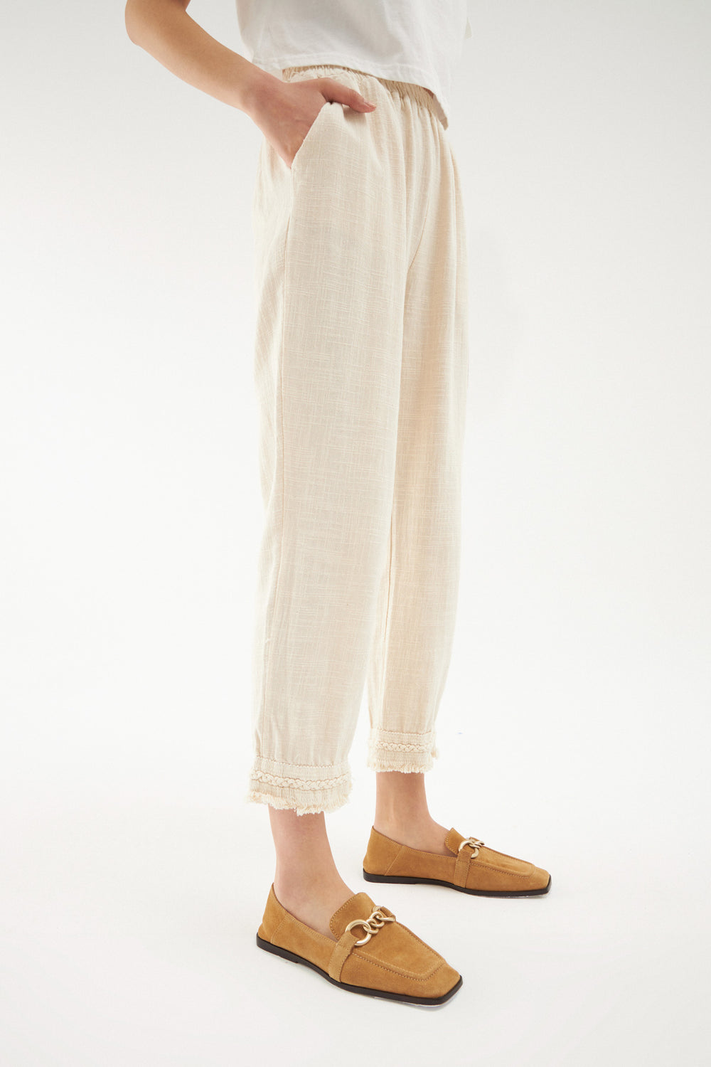 Beli büzgülü pantolon modeli, keten ve pamuk içeriği dokusu ile sana mevsimde hafifliği hissettirecek favori parçalardan. Paçasındaki püskül detayı ile hareket kazanan cepli havuç kesim pantolon modeli ile mevsimde rahatlığı hisset. Cepli yüksek bel pantolon modelinin keten karışımlı dokusunu keten crop top veya keten ceket modellerimizin enerjisi ile birleştir!