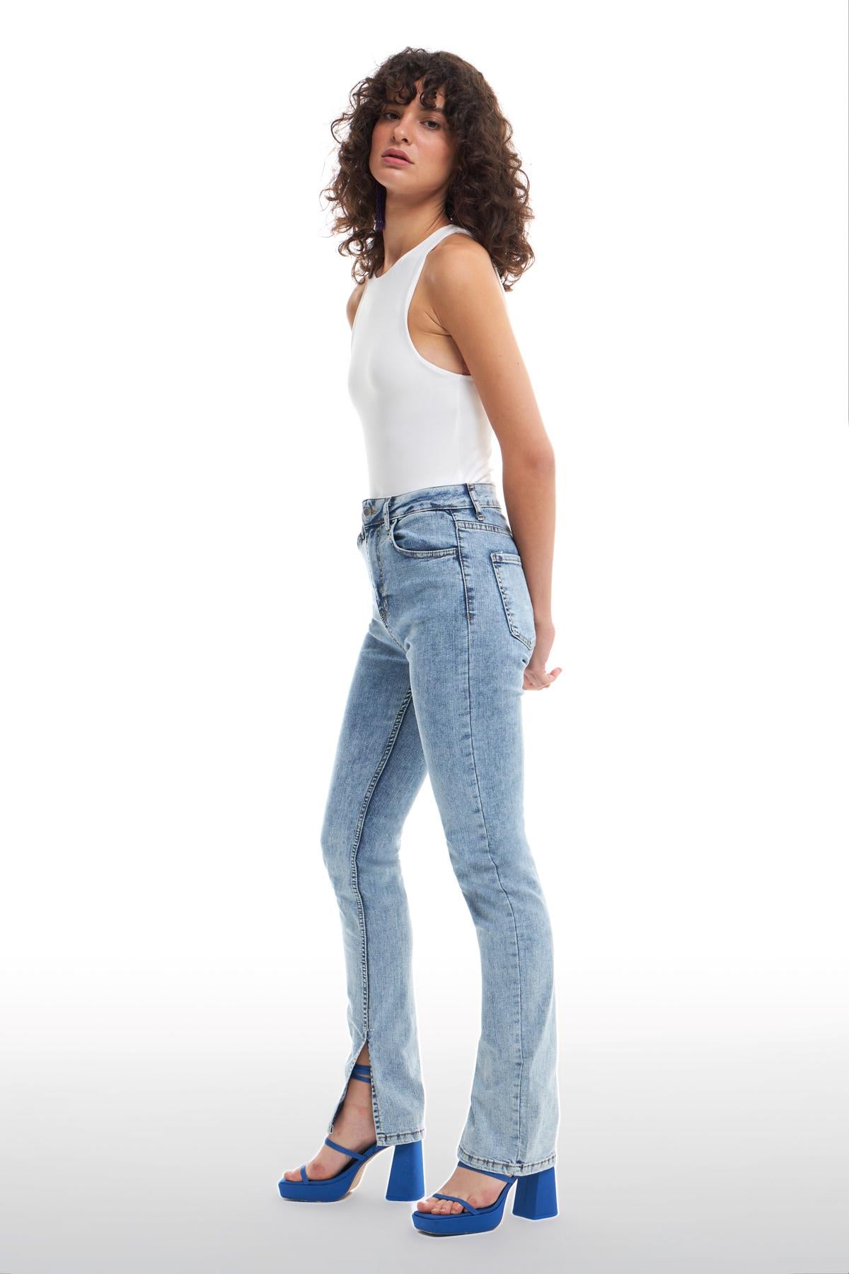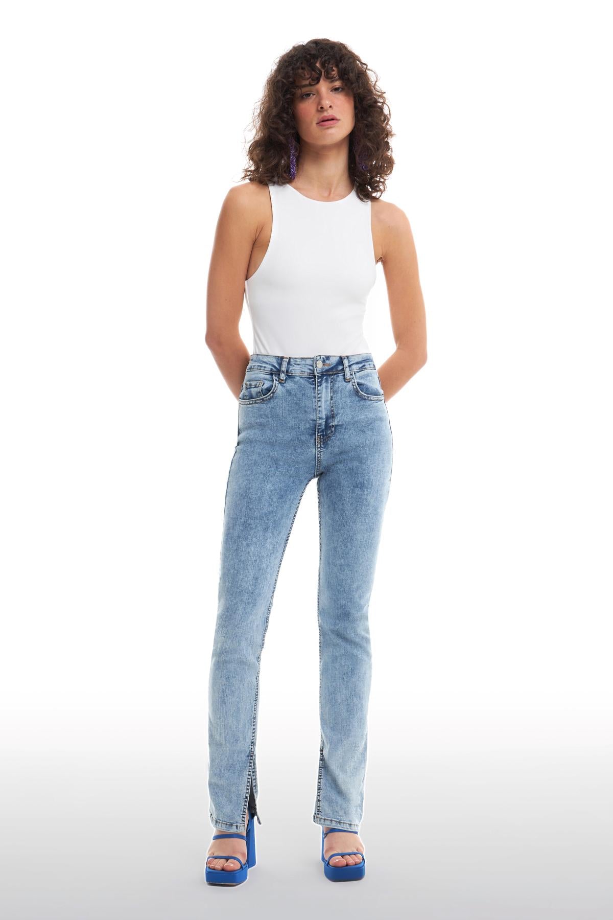 Yüksek bel, metalik fermuarlı, cepli, metalik düğmeli, vücudu saran kesim, iç paçası yırtmaç detaylı kot pantolon.