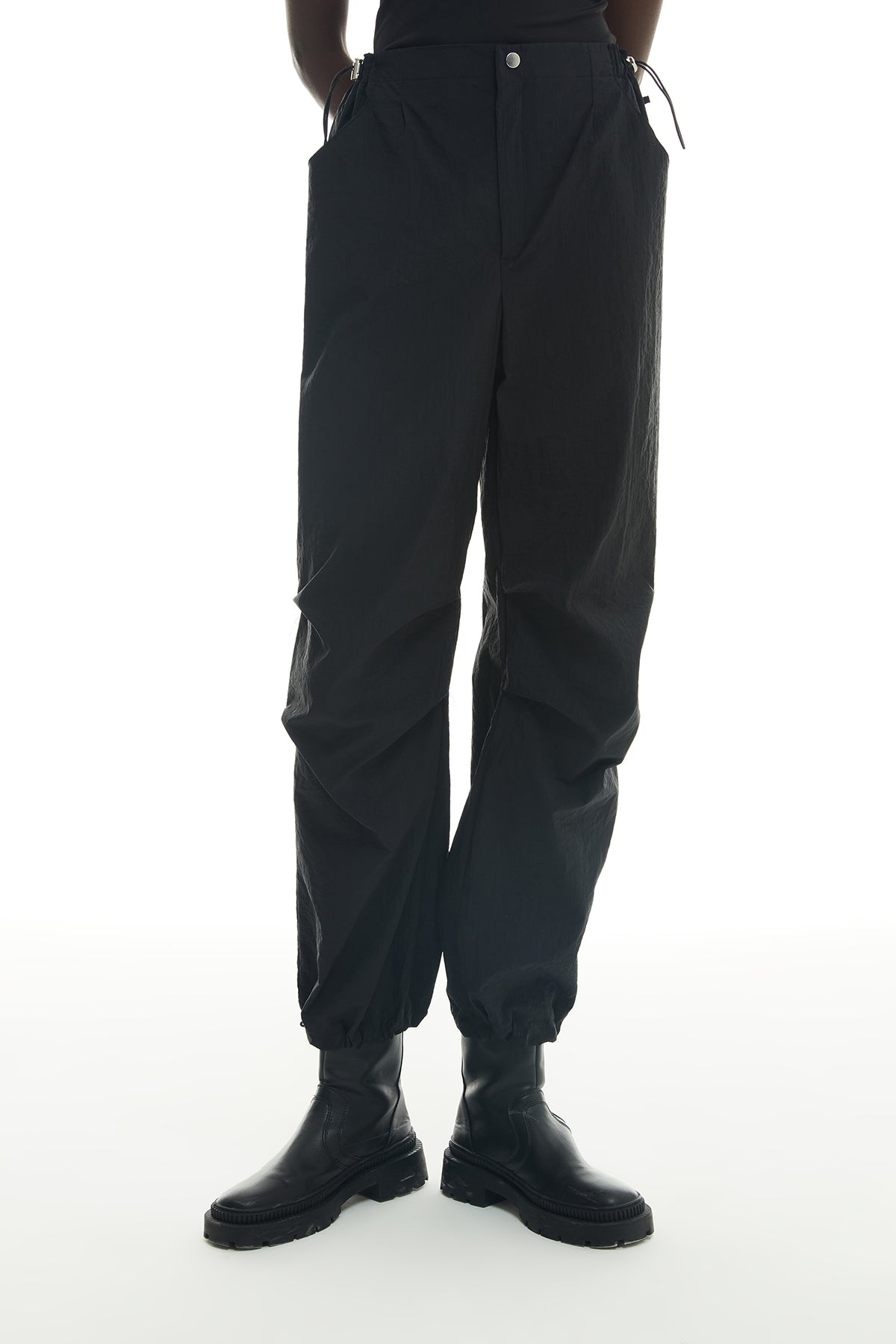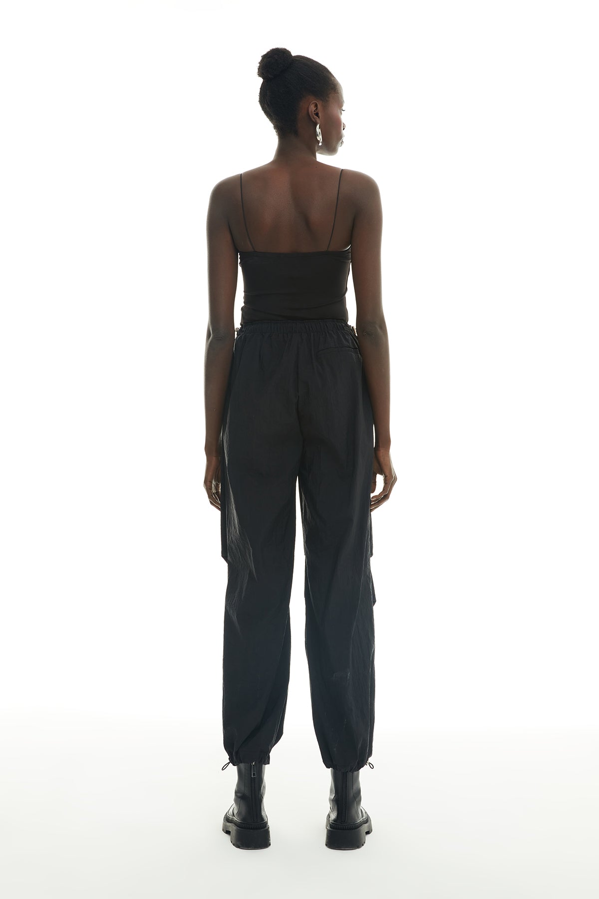 Beli lastikli ve ayarlanabilir, fermuarlı ve çıtçıt düğmeli, paçası ayarlanabilir, yüksek bel, rahat kesim, cepli paraşüt pantolon.