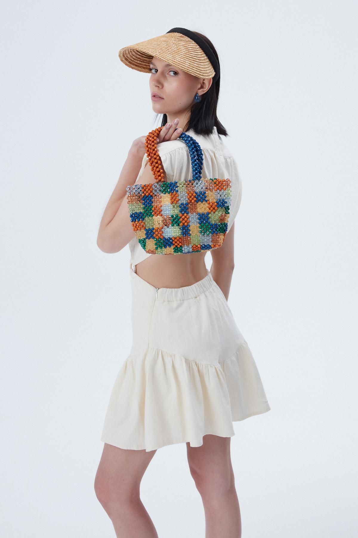 Mini fırfırlı elbise modeli, romantik ve eğlenceli bir görünüm sunarken, sırt dekoltesi ile de dikkat çekici bir görünüm sunuyor. Stiline zahmetsiz bir çekicilik ve modern bir görünüm sunmak istiyorsan sırt dekolteli mini elbise modeli harika bir seçenek olabilir. Kolsuz elbise modeli bel kısmındaki toka aksesuarı ve cut-out kesimi ile oldukça şık görünüyor. Yandan fermuarlı ve arka bel kısmının lastikli oluşuyla rahat giyim sağlar. Arka ense kısmı düğmelidir.