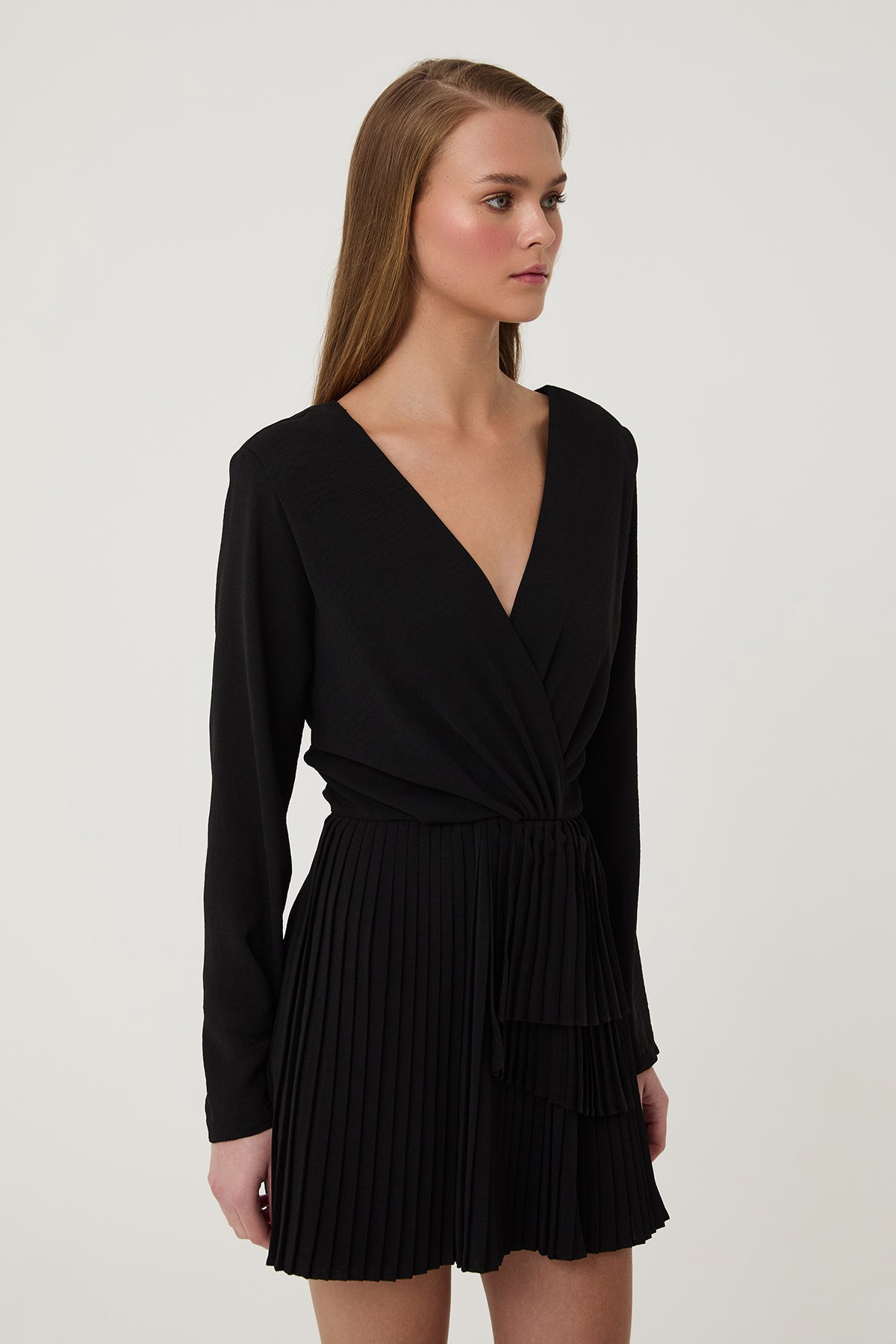 Pilise Detaylı Kruvaze Yaka Kısa Tulum Siyah