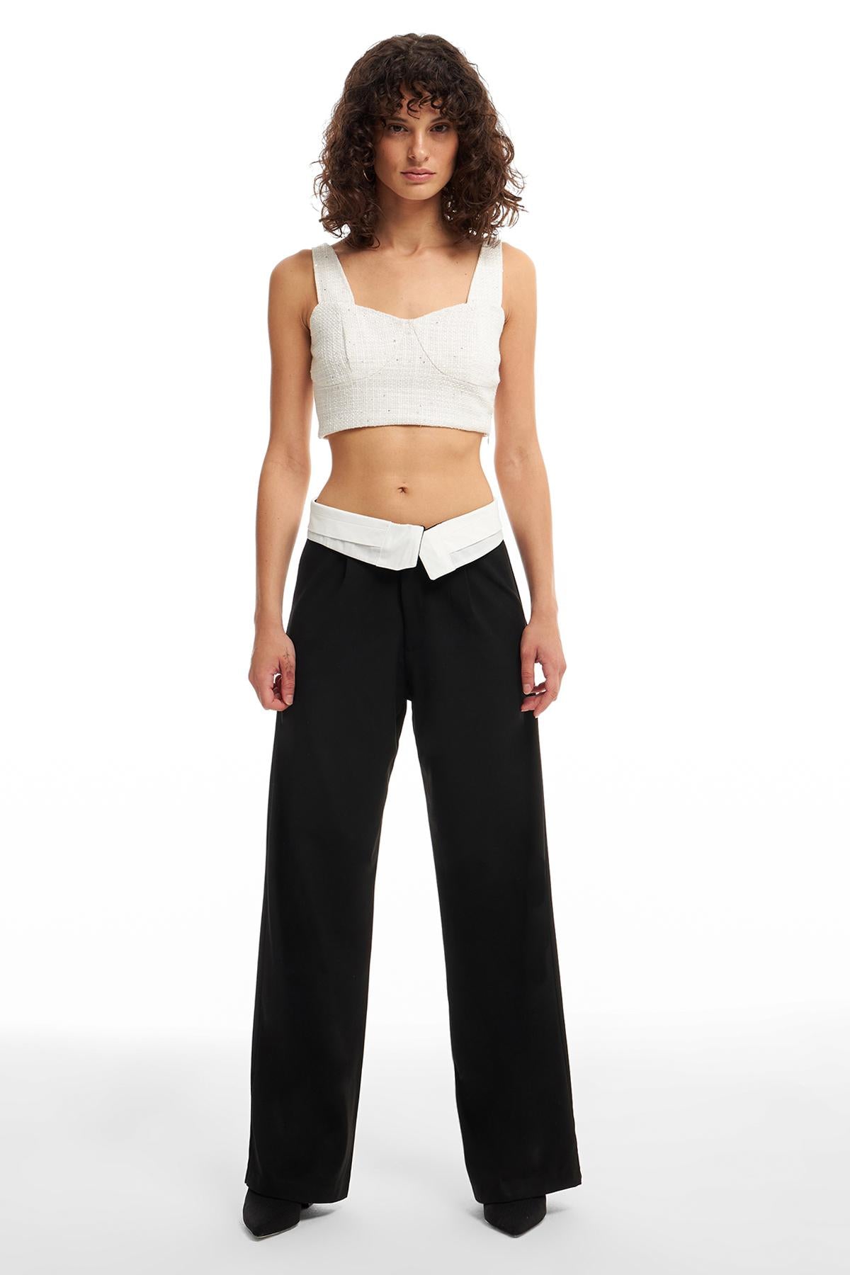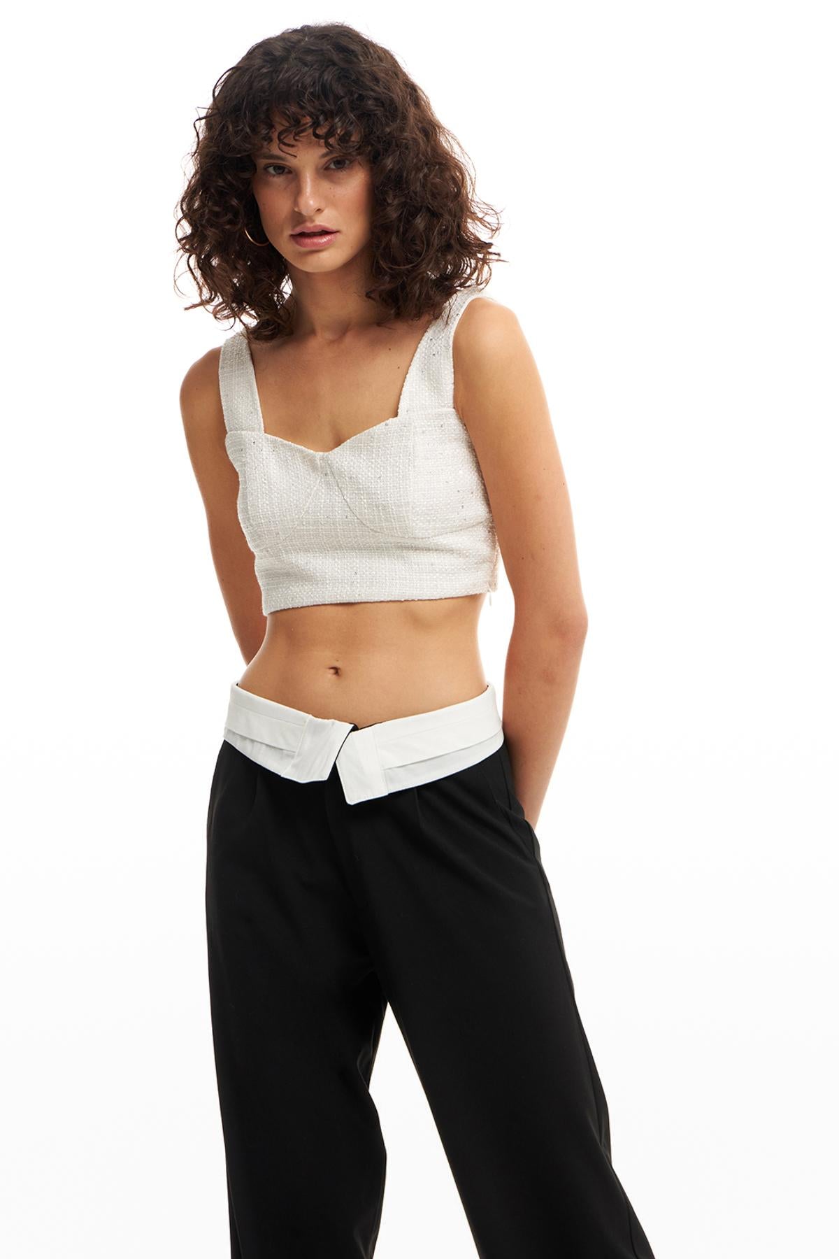 Kalın askılı, crop kesİm, yandan gİzlİ fermuarlı, parlak pul detaylı, pamuk İçerİklİ bluz.
