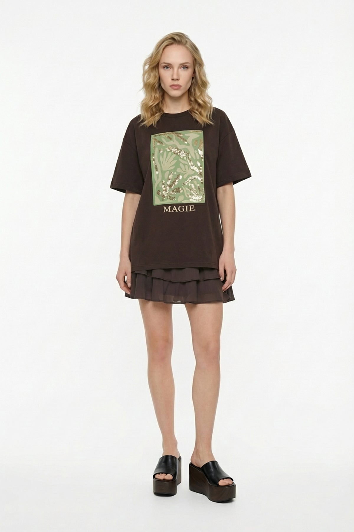 Pul İşlemeli Baskılı Oversize Tişört Kahverengi