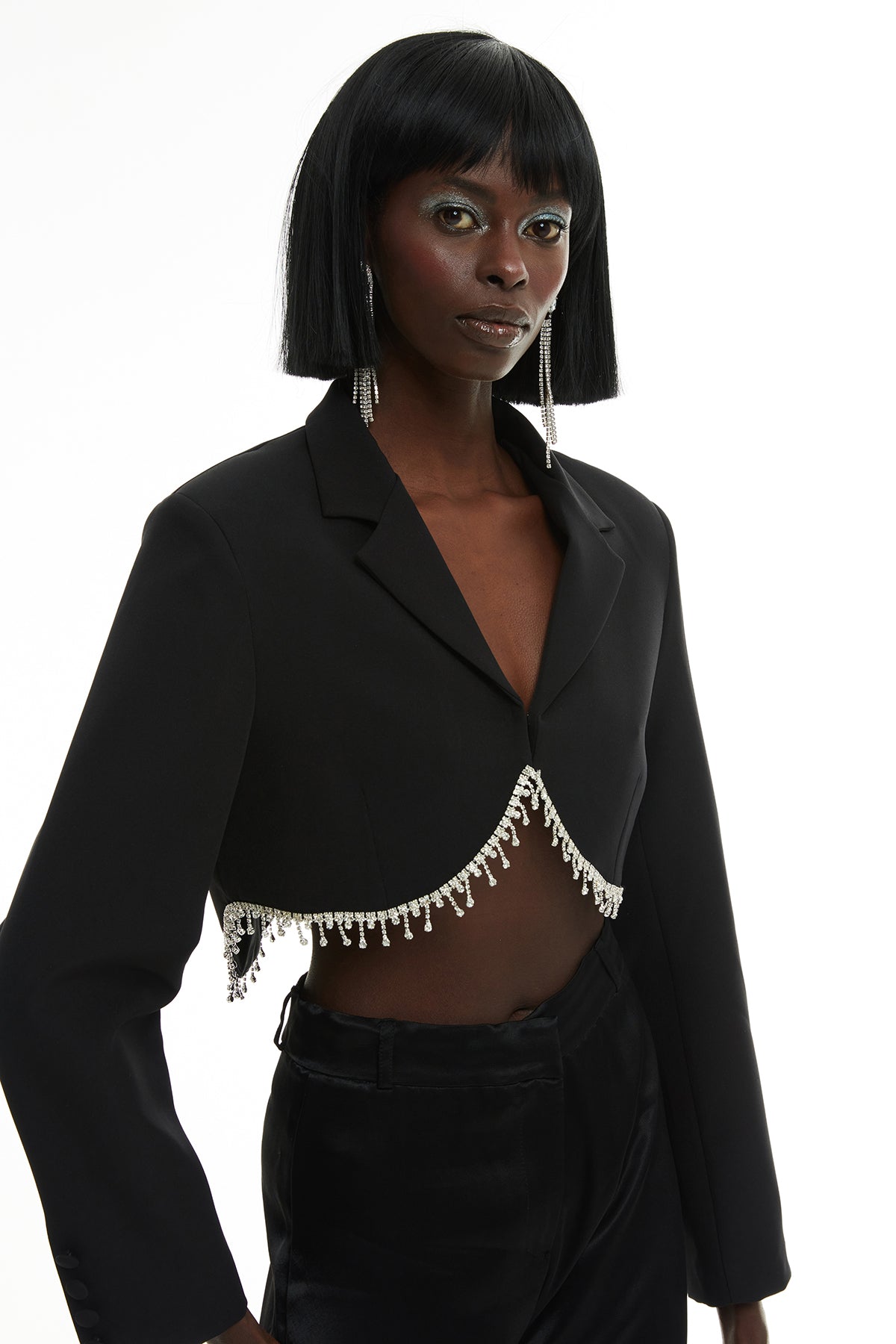 Vatkalı, uzun kollu, asİmetrİk kesİm, önü İlİklemelİ, parlak taş İşleme detaylı, crop blazer ceket.