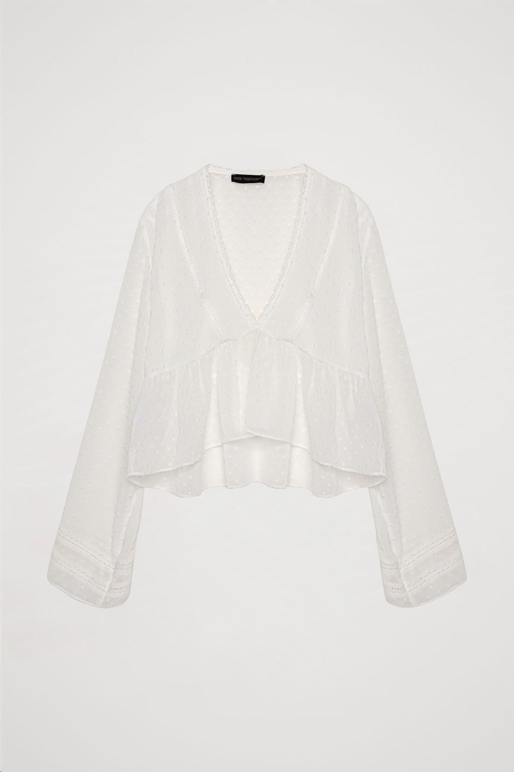 V yaka, kolları dantel detaylı, uzun kollu, puantiye desenli, dökümlü fırfırlı, hafif yapısı nedeniyle iç gösterebilir, zarif ve şık tasarımlı şifon bluz modeli.