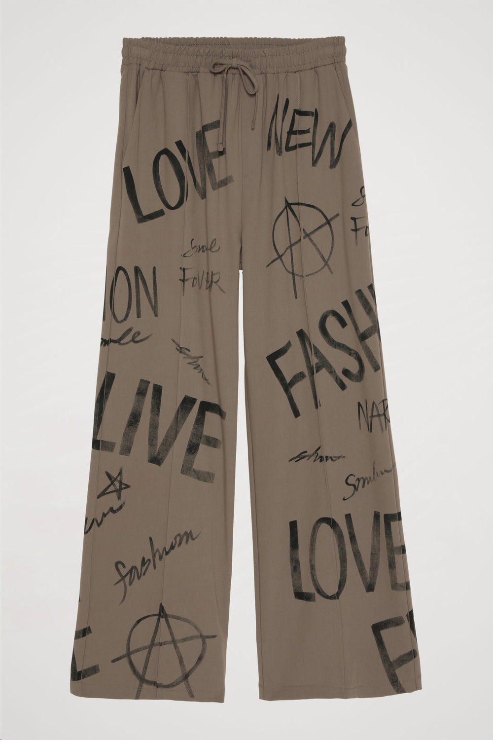 Yazı baskı detaylı, yüksek bel, geniş paça, beli lastik bağlamalı, çift cepli, modern ve şık görünümlü bol paça pantolon.