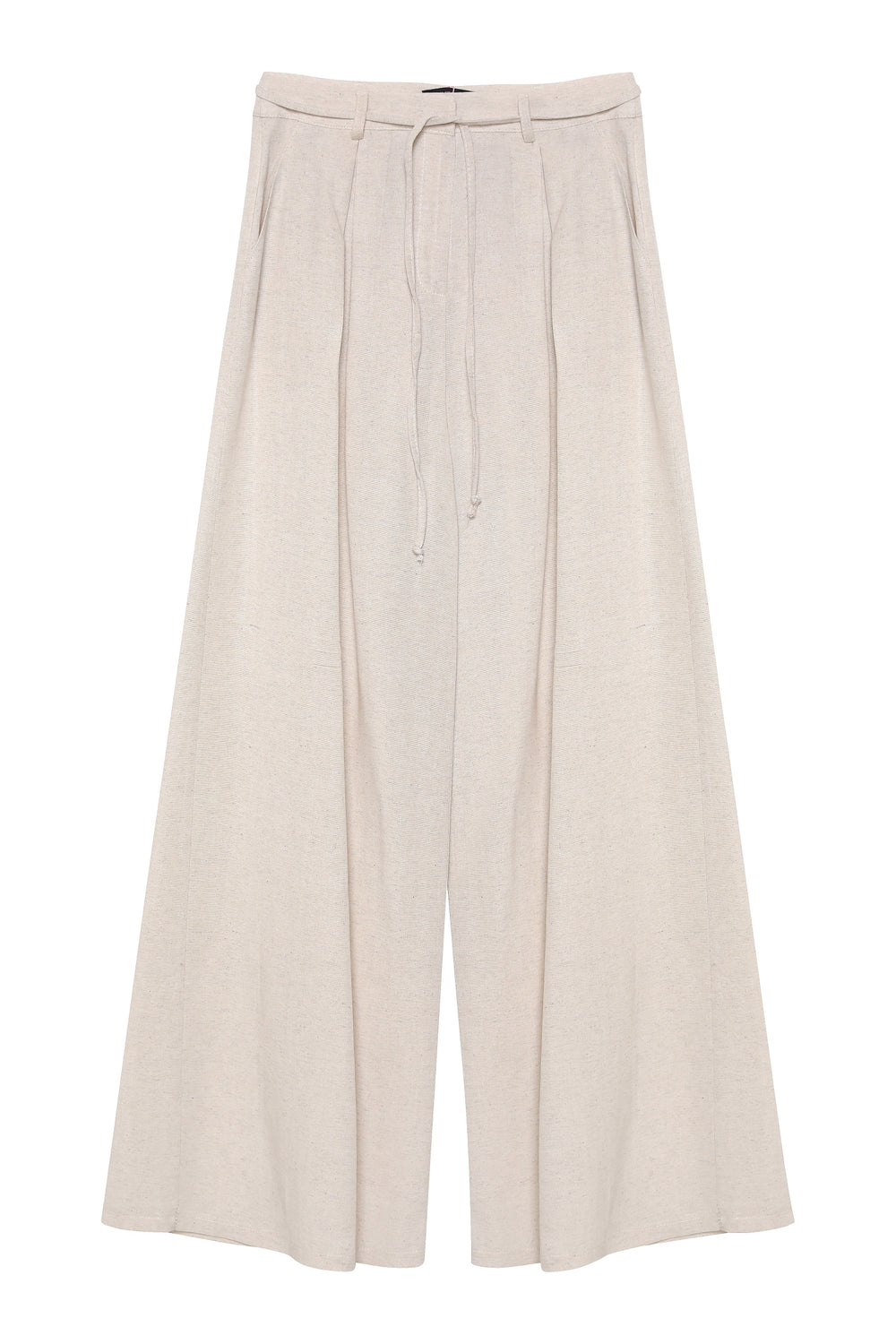 Keten karışımlı,yüksek bel, cepli, önü bağcık detaylı, geniş paçalı pantolon.