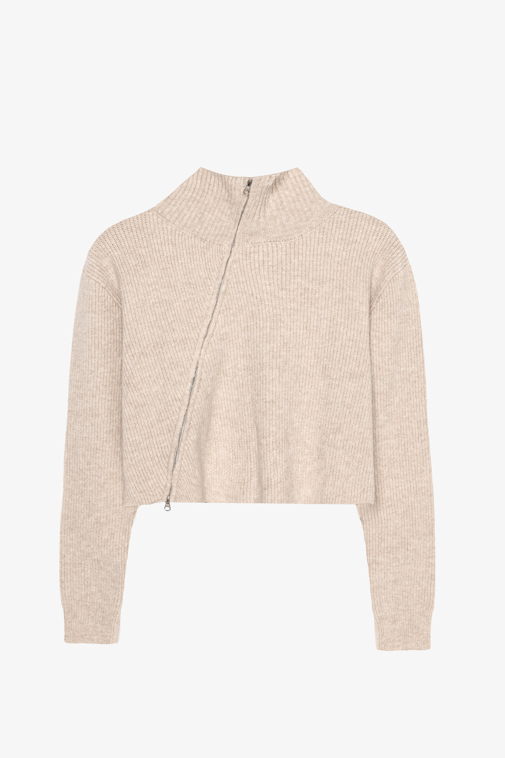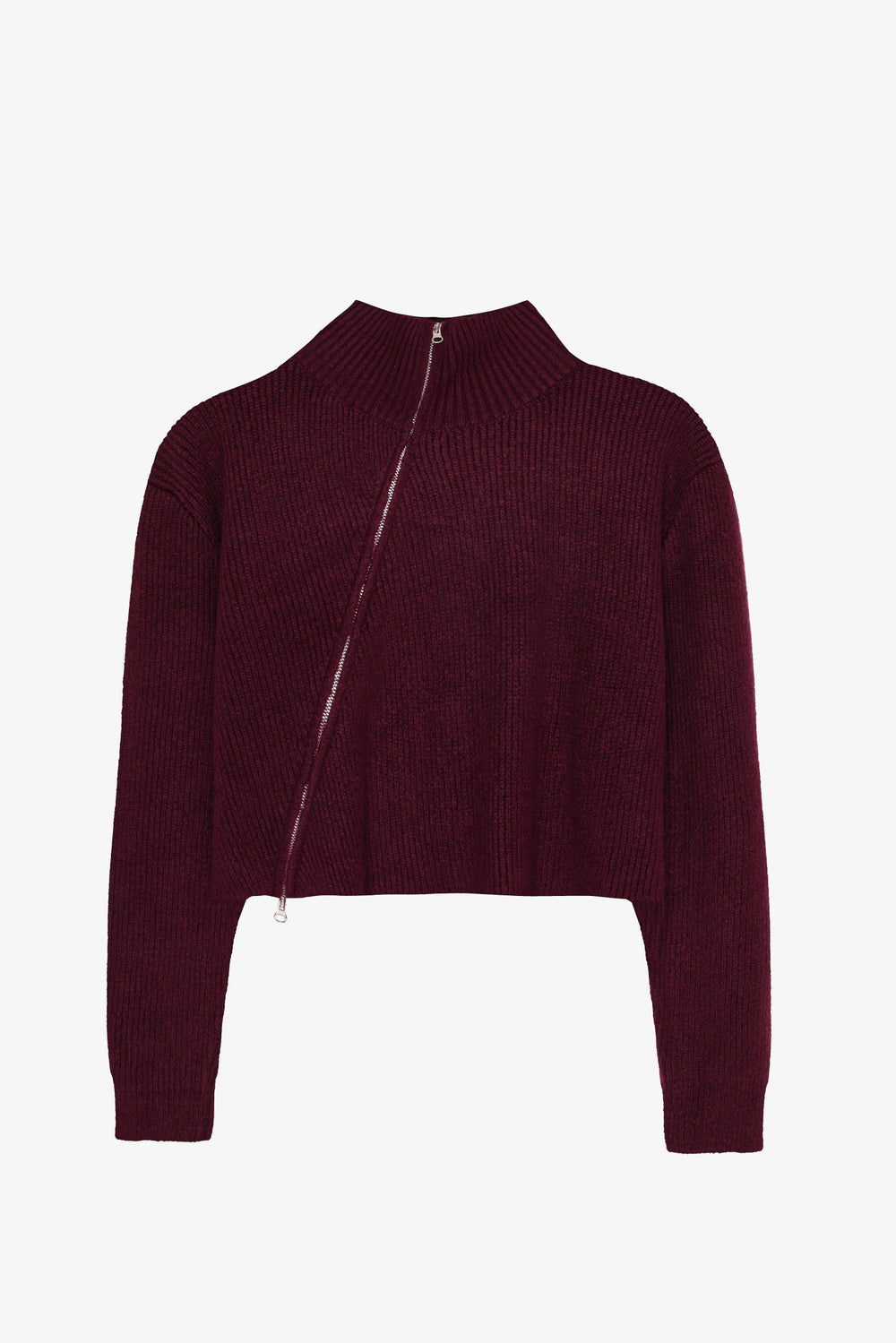 Asimetrik Fermuarlı Triko Kazak Mürdüm