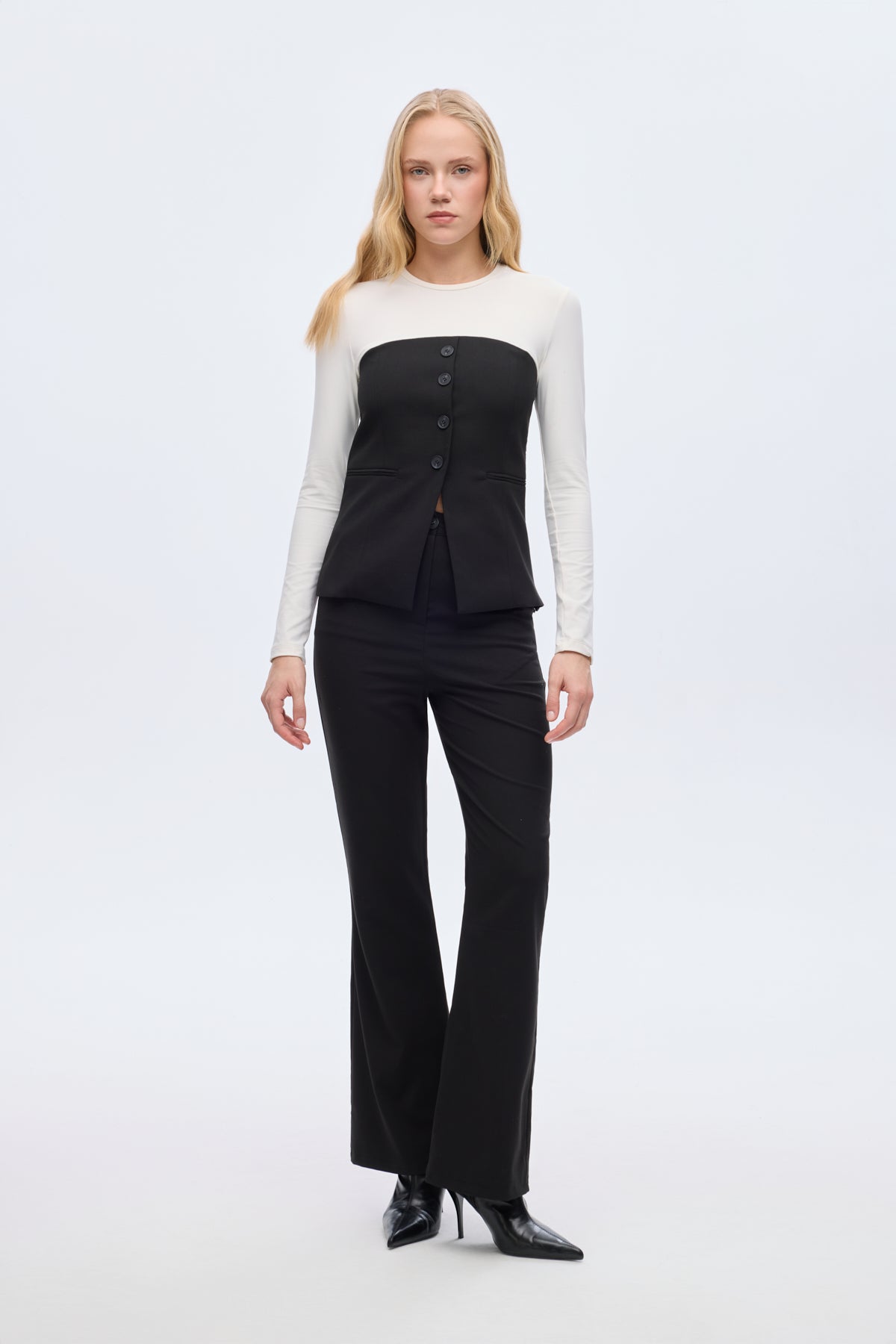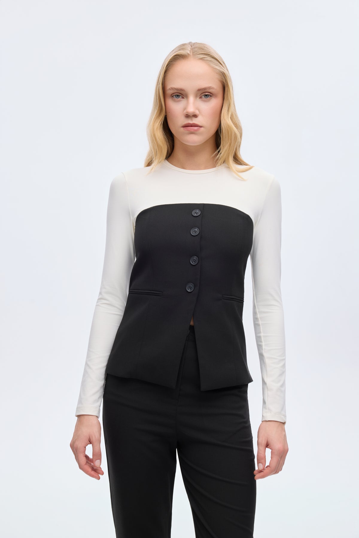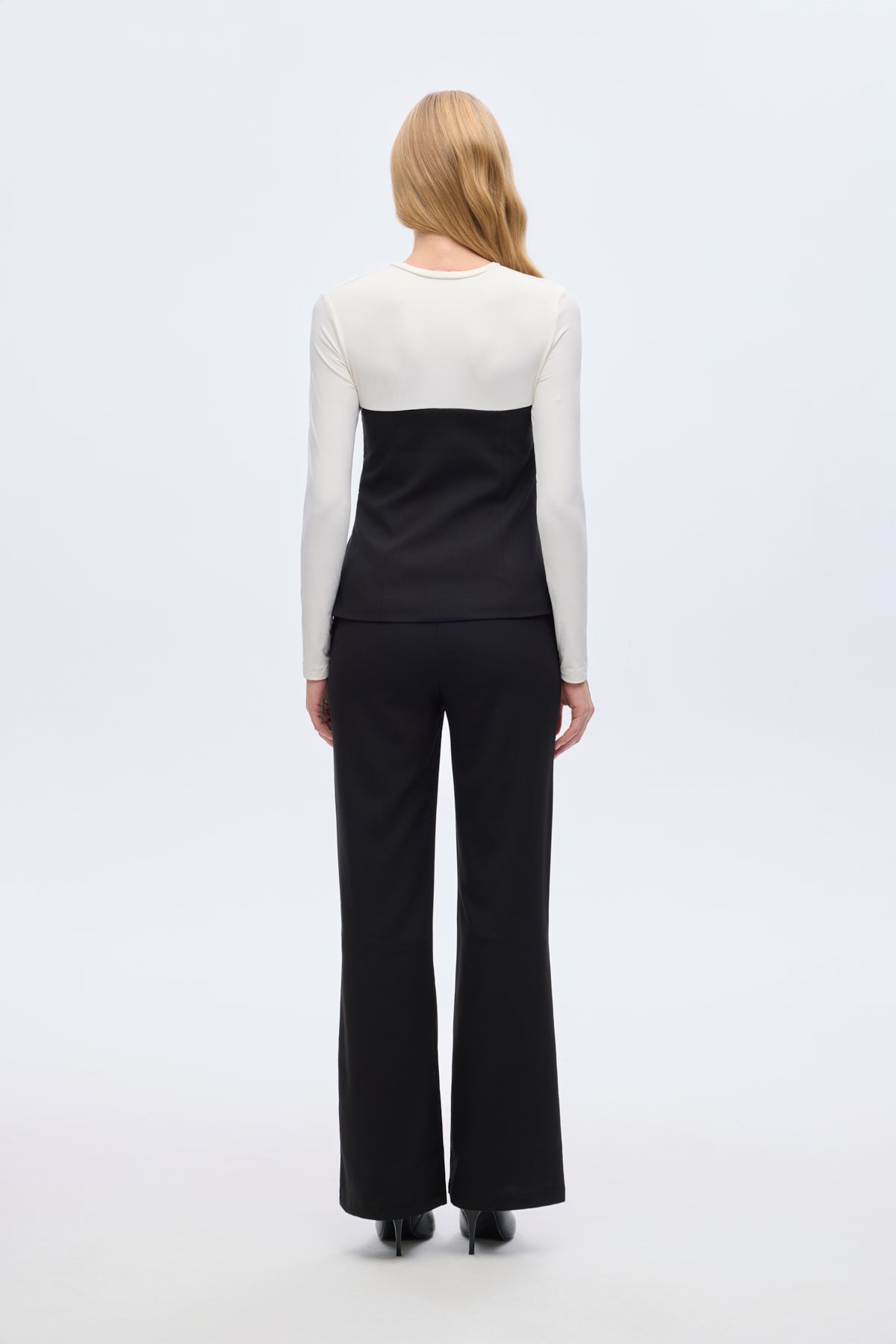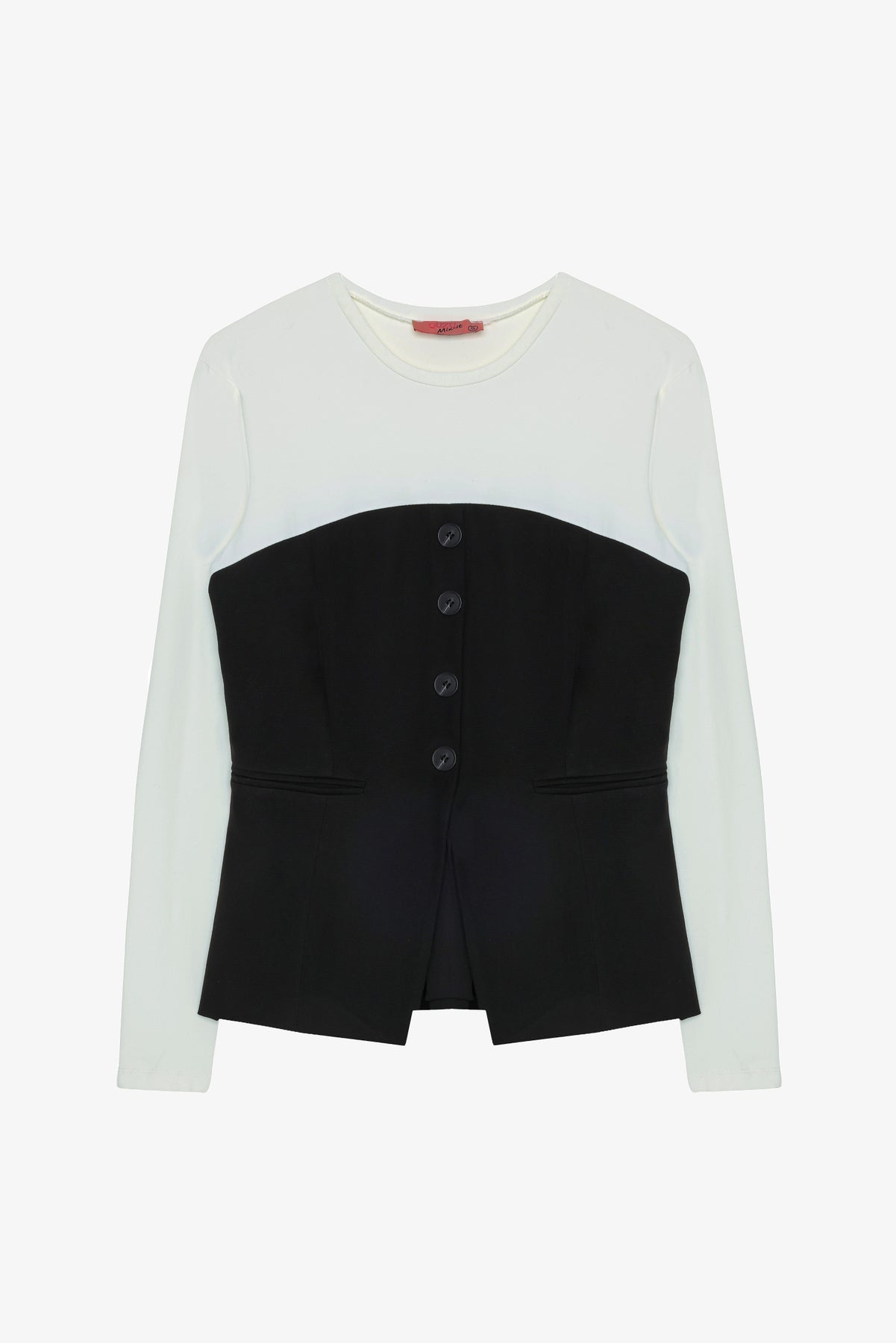 Renk Bloklu Kumaş Garnili Bluz Siyah