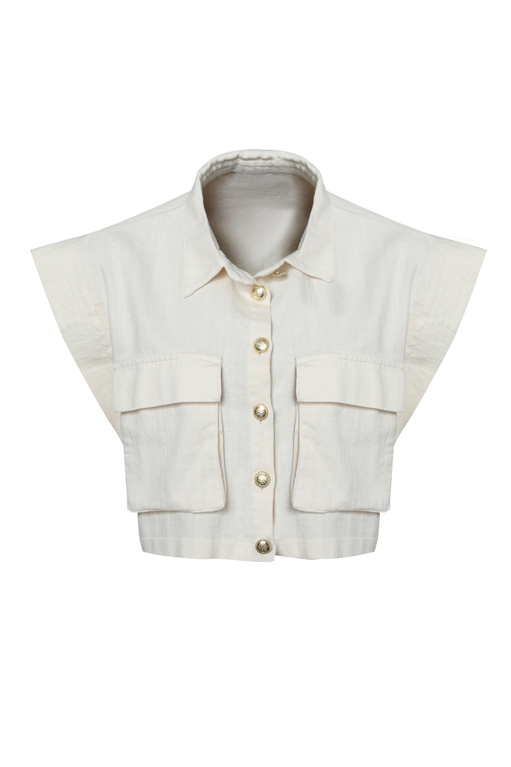 Kısa kollu, rahat kesimli, 2 cep detaylı, düğme kapamalı crop gömlek.
