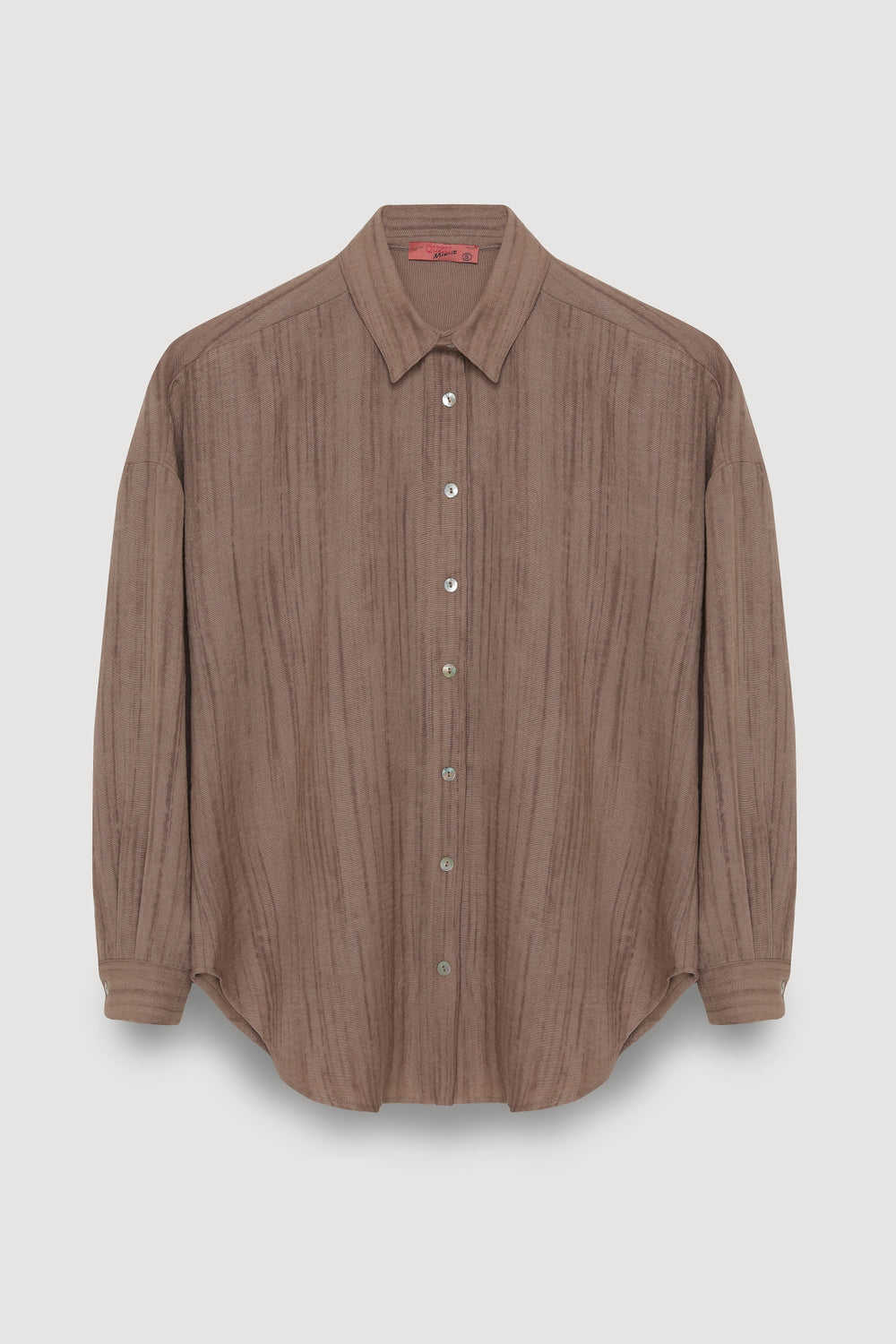 Dokulu kumaş detaylı, klasik gömlek yaka, uzun kollu, önü düğmeli, modern ve zarif görünümlü oversize kesim gömlek.