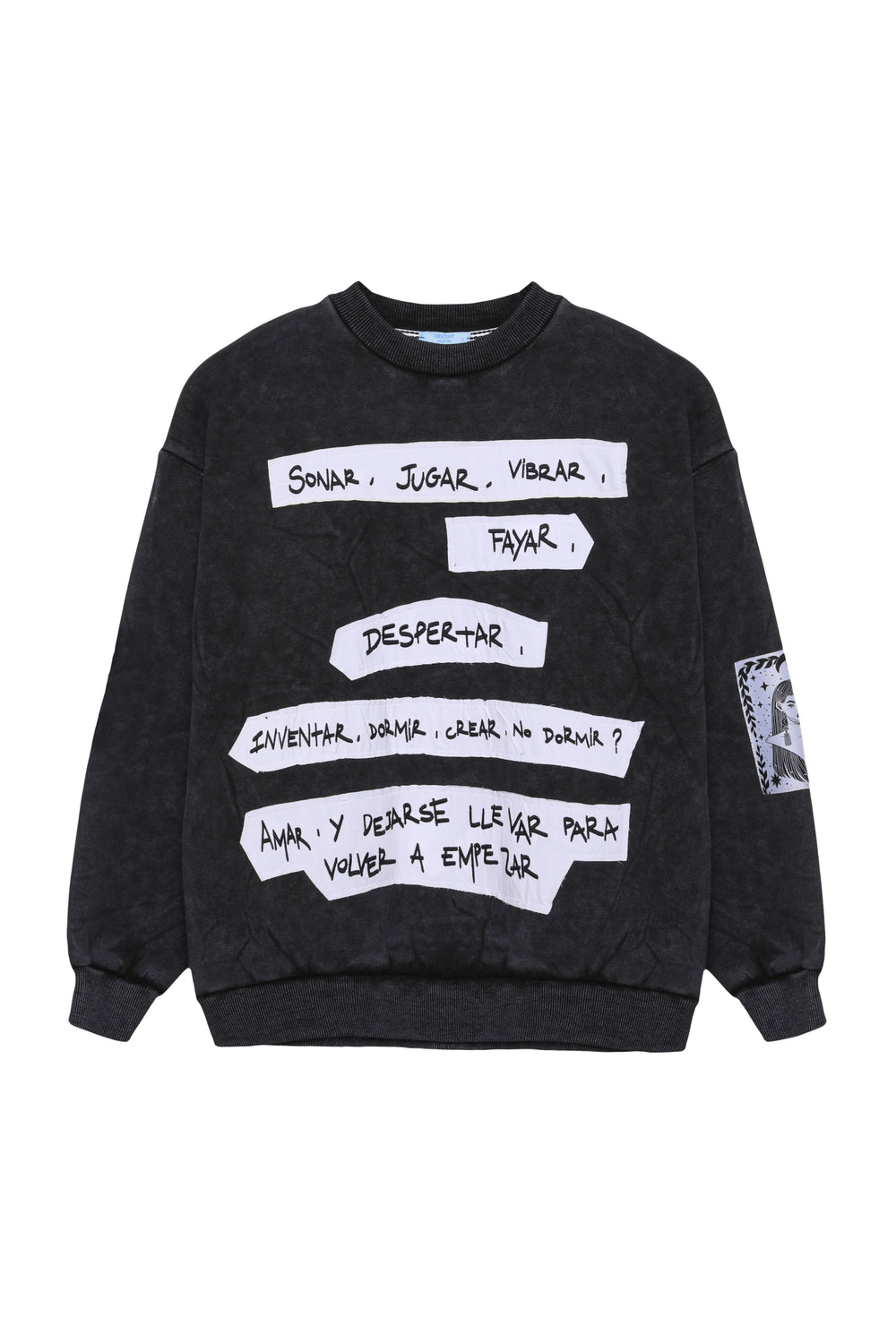 Patch yazı baskı detaylı, eskitme görünümlü, içi şardonlu, oversize uzun kollu sweatshirt.
