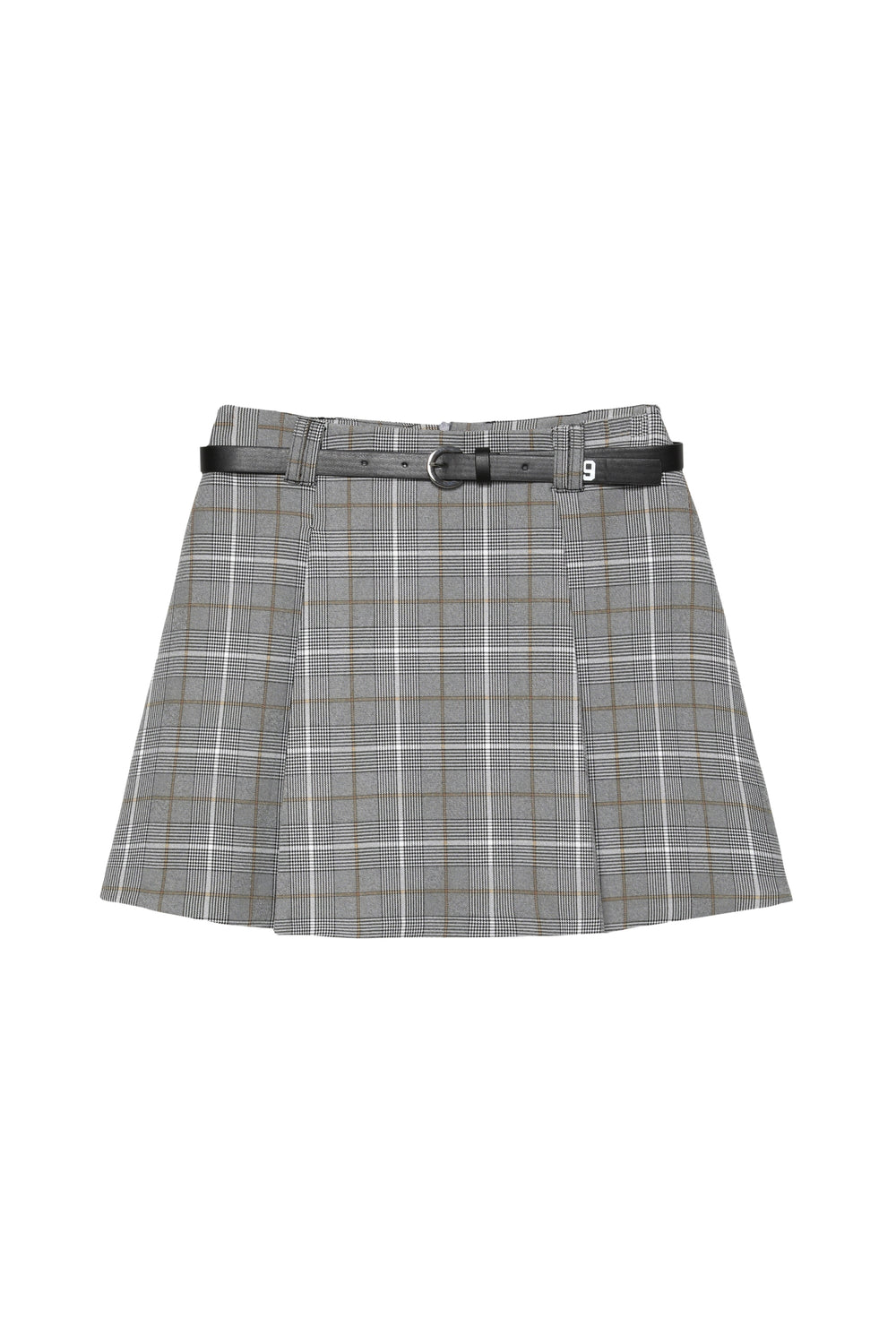 Kemer Aksesuarlı Kareli Mini Etek Gri