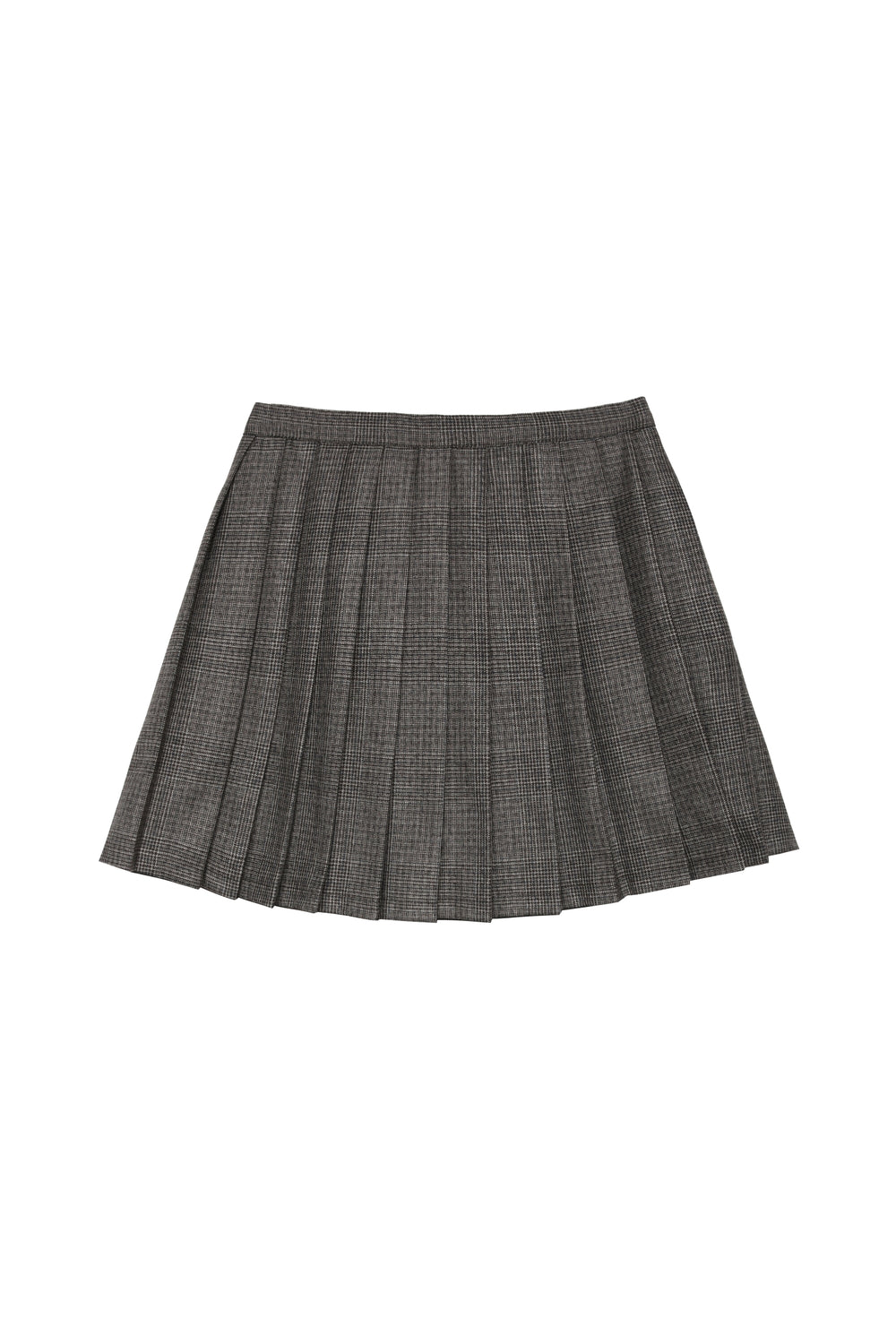 Yüksek bel, pileli, beli lastikli, içi astar şortlu, kare desenli mini etek.