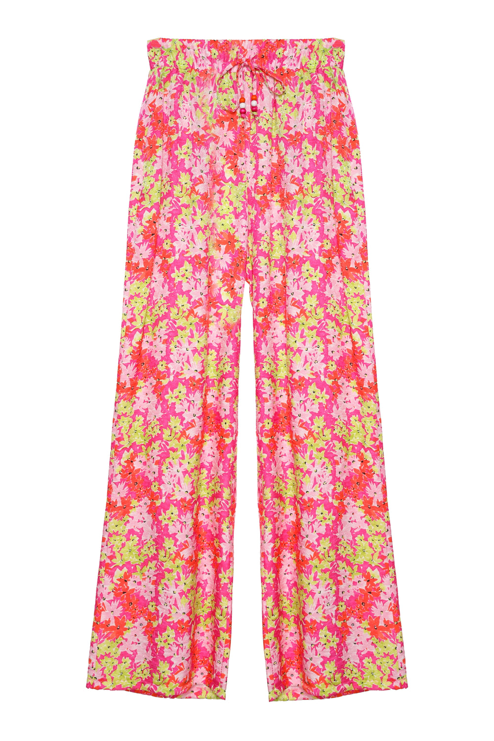 Renkli Çiçek Desenli Beli Lastikli Pantolon Fuşya