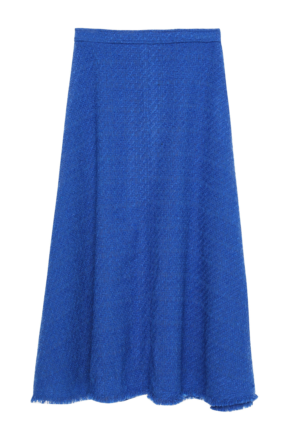 Pamuk karışımlı, yüksek bel, yandan gizli fermuarlu, ucu püsküllü,tüvit midi etek.
