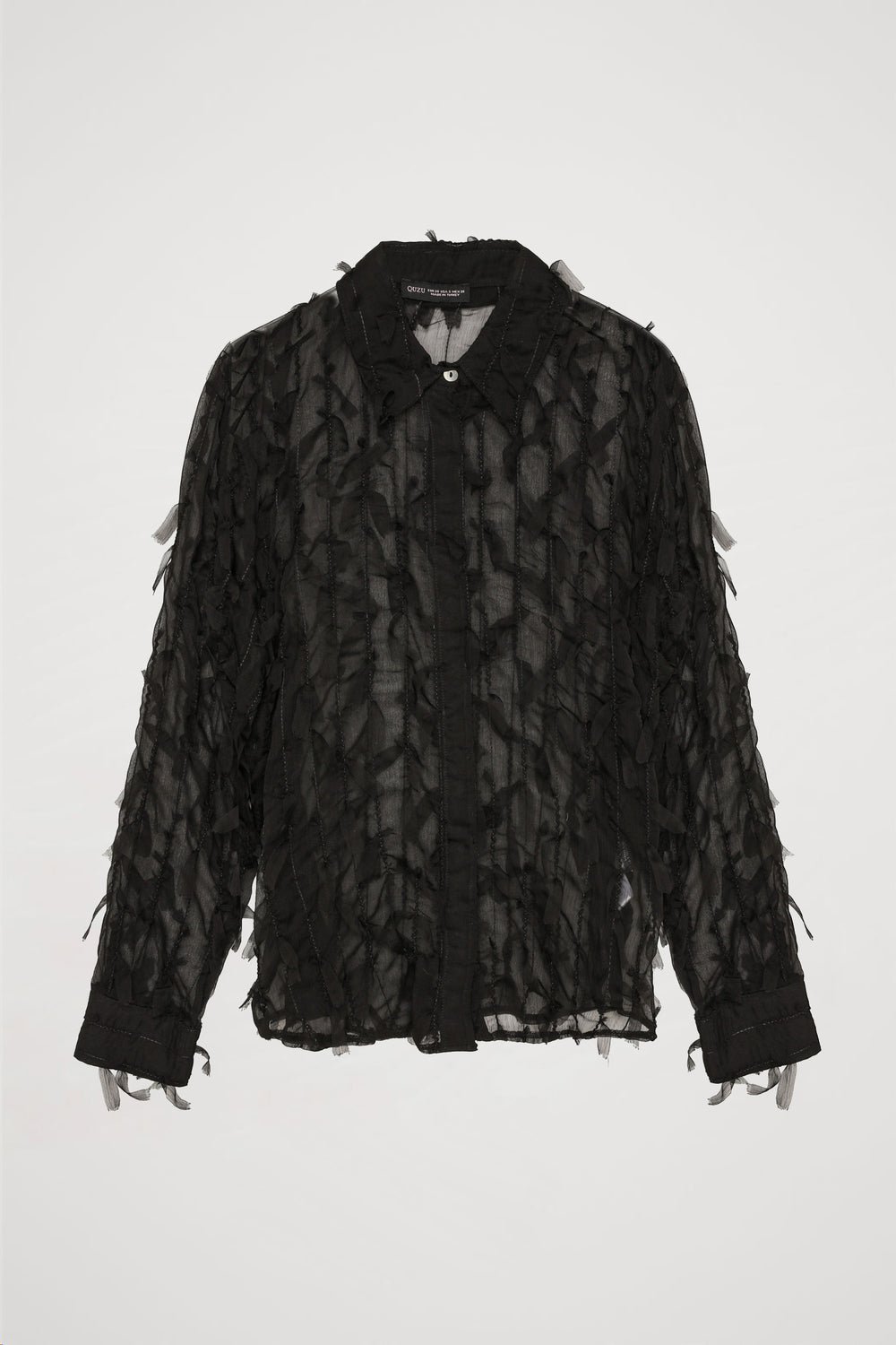 Tüy fırfır detaylı, uzun kollu, düğme kapamalı şifon gömlek.