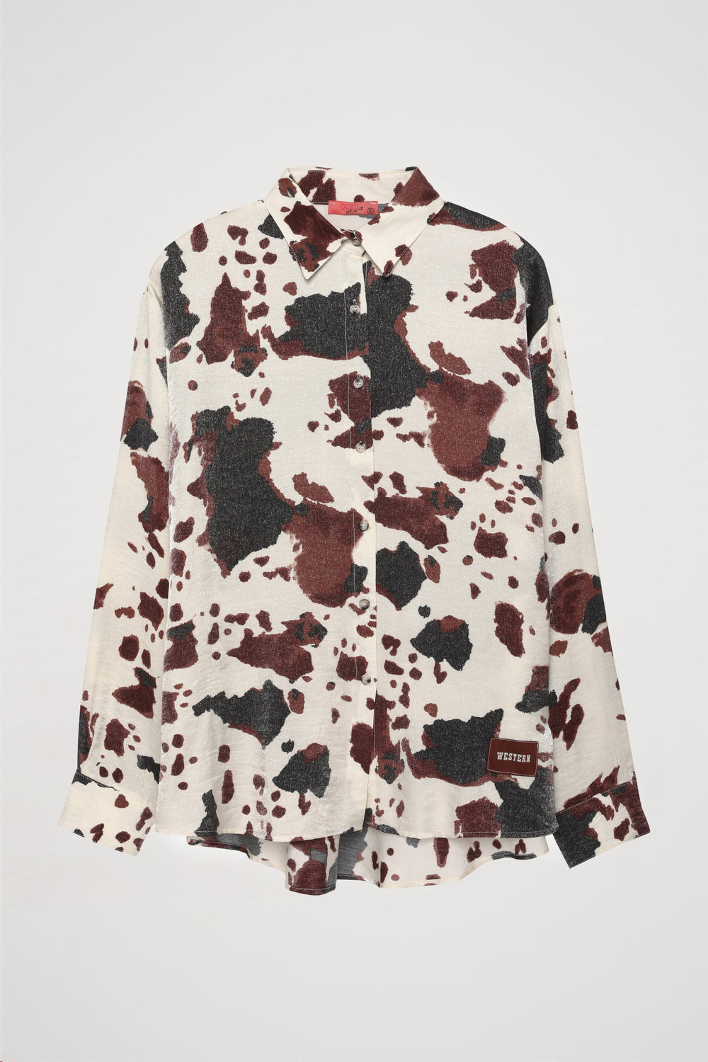 Leke desenli, klasik gömlek yakalı, uzun kollu, düğme kapamalı, oversize kesimli, şık ve modern görünümlü gömlek.