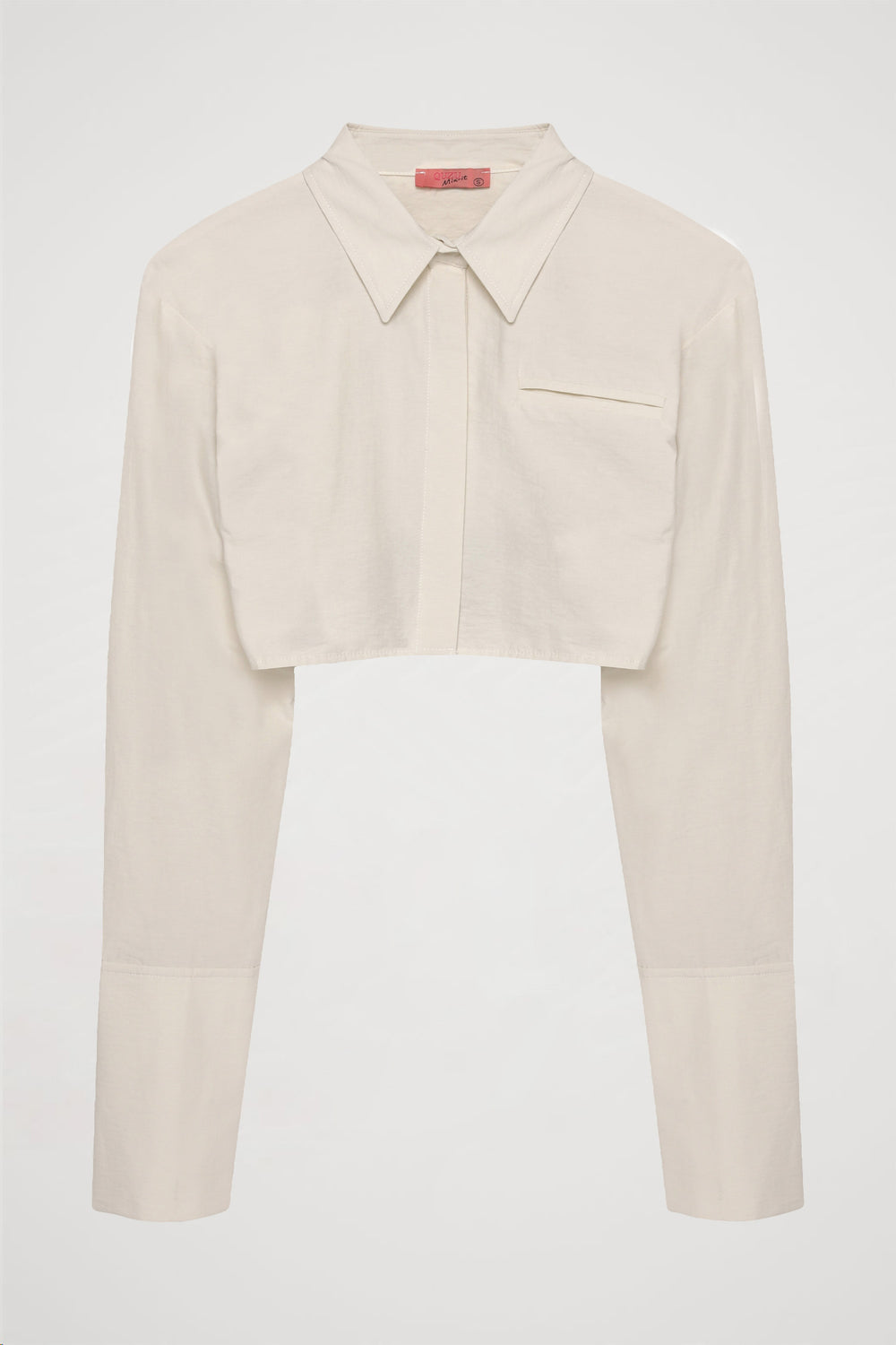 Sırt kısmında toka şeritleriyle açık detaylara sahip, uzun kollu, kolları düğme detaylı, şık bir crop gömlek.
