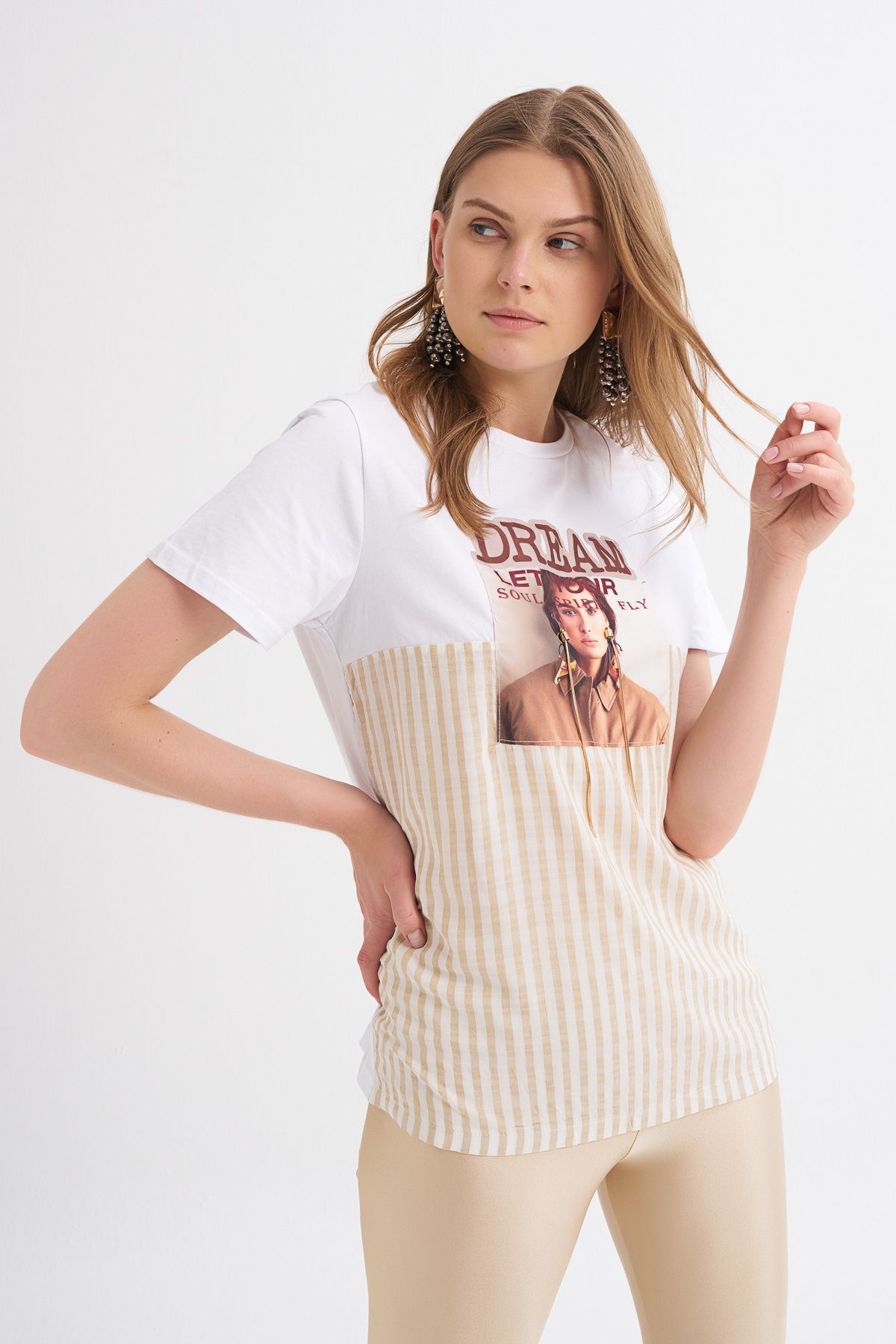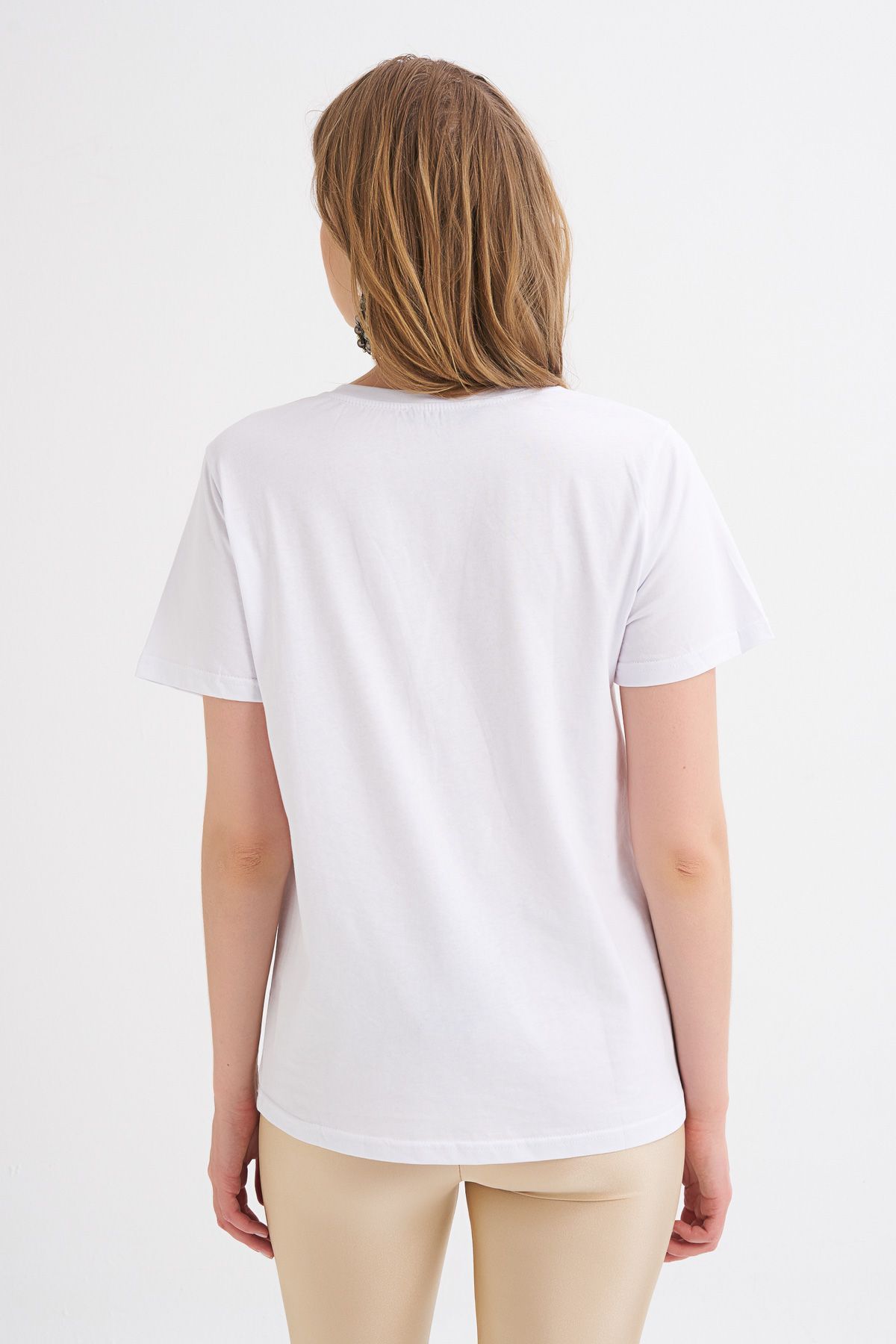 Garnili Baskılı Aksesuar Detaylı Tişört Beyaz