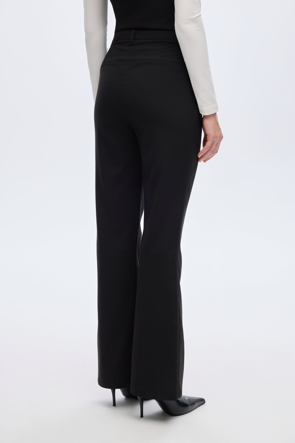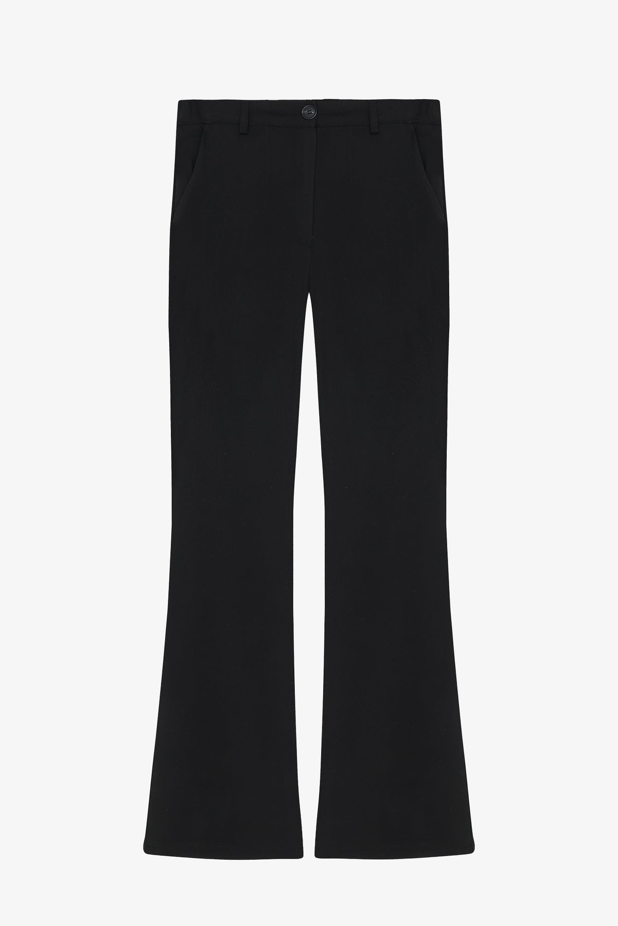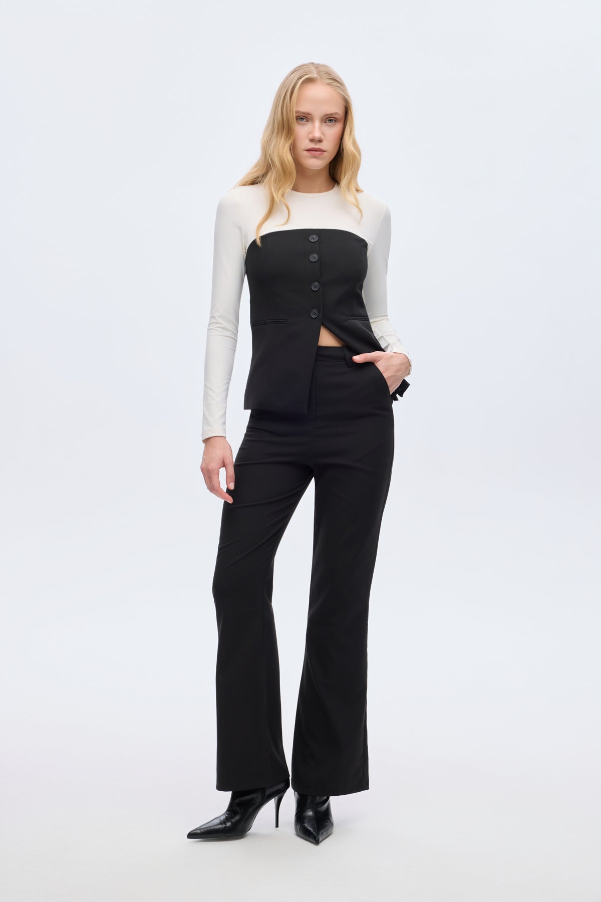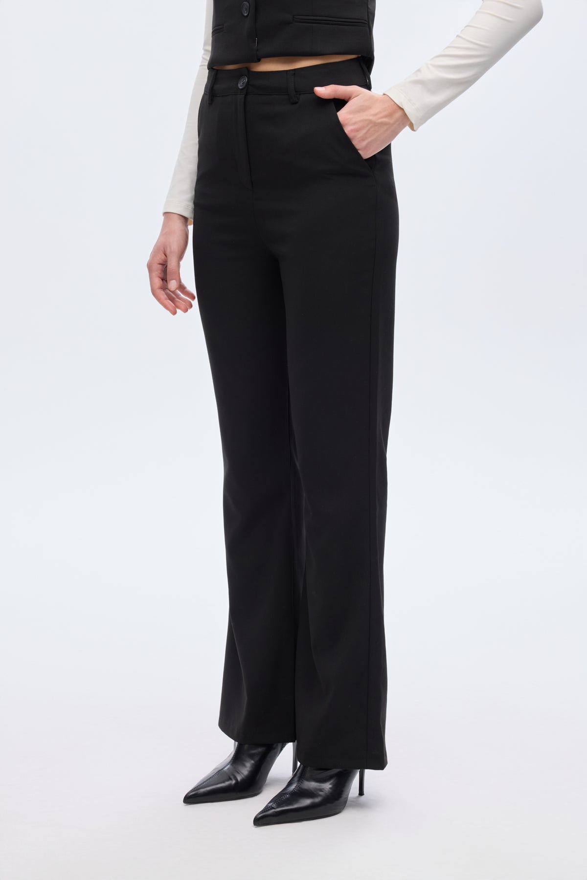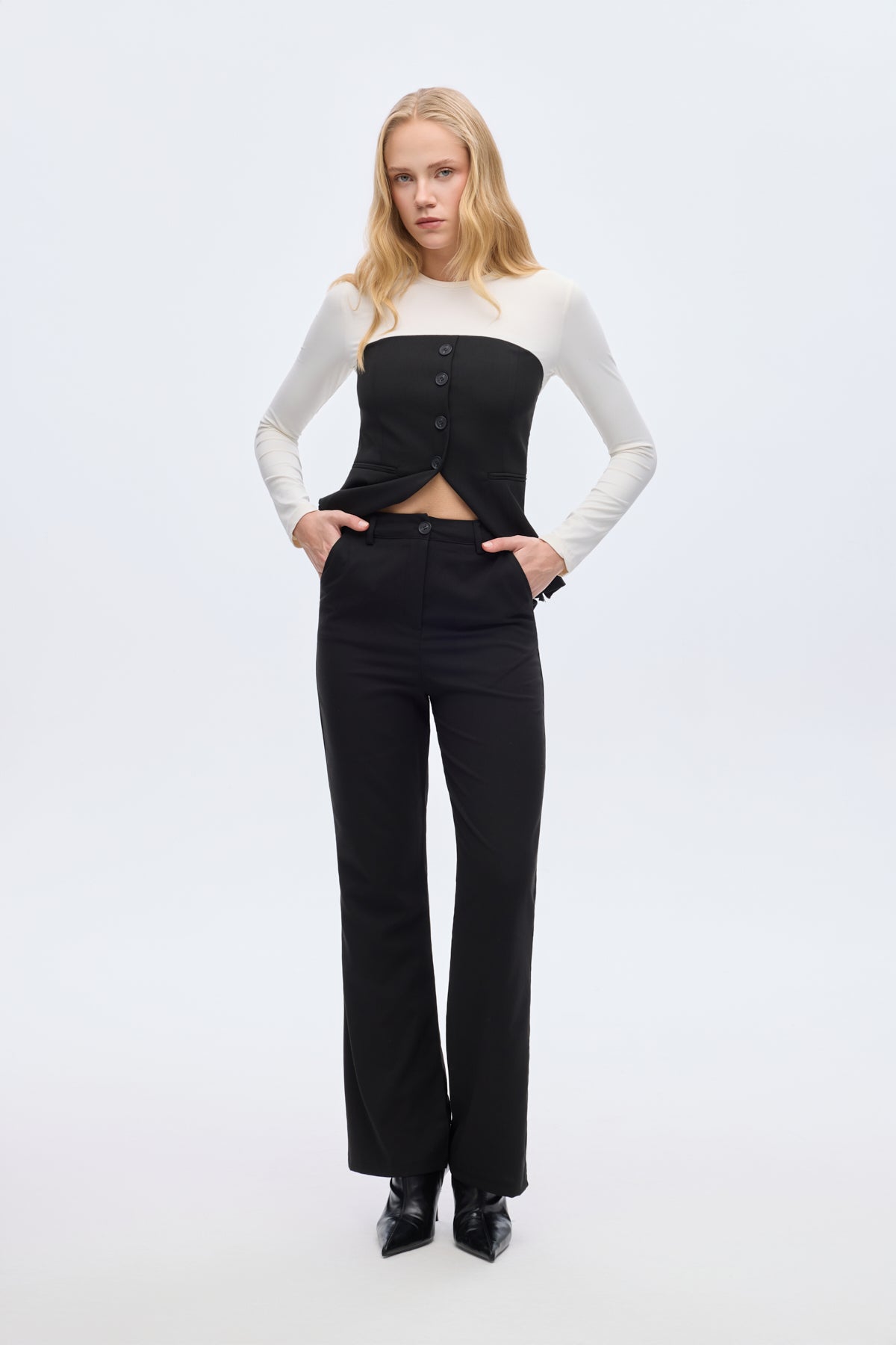 Yüksek bel, önü fermuar ve düğme kapamalı, kemer köprülü, yan cepli, arkası gizli cep detaylı, ispanyol paça uzun pantolon.