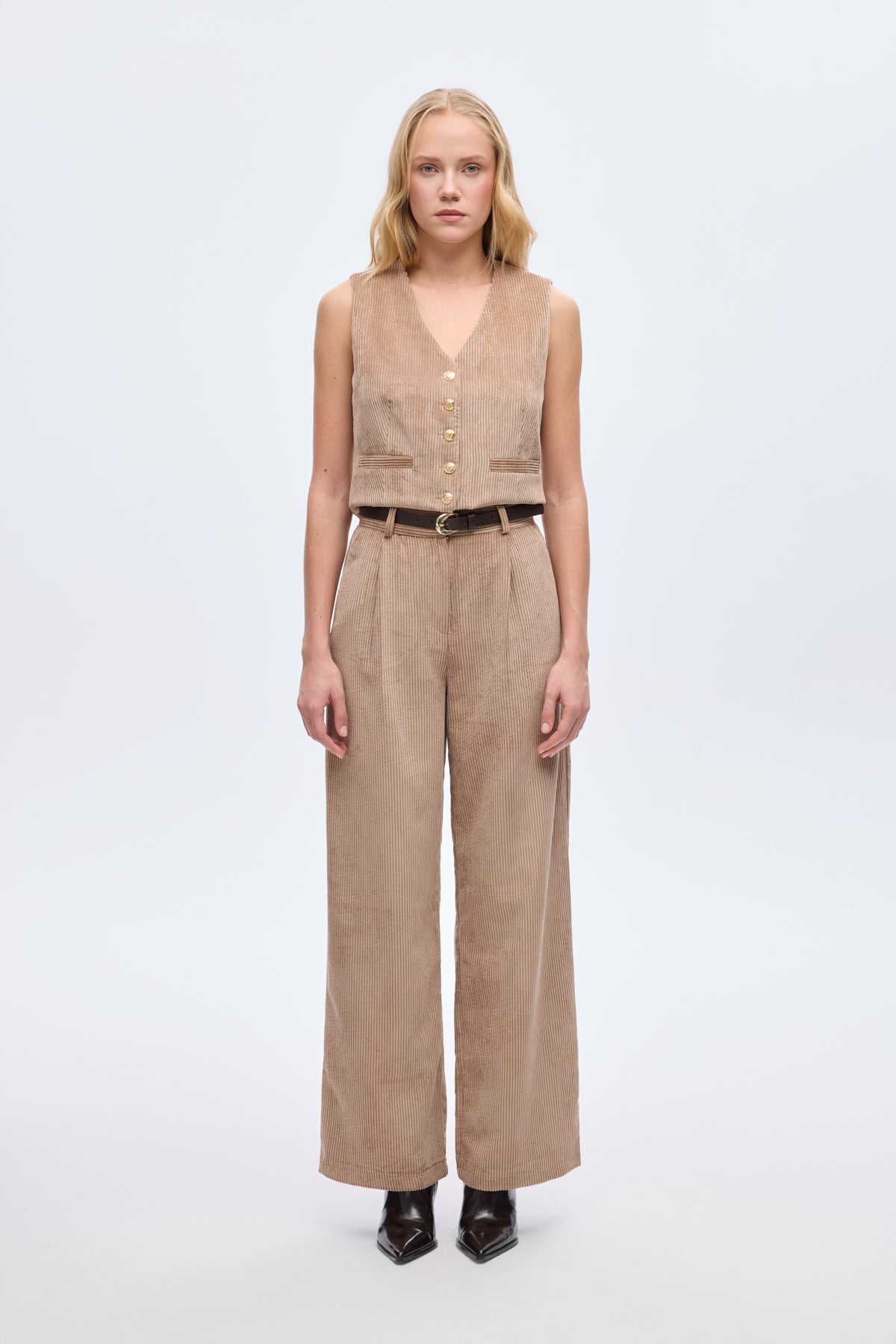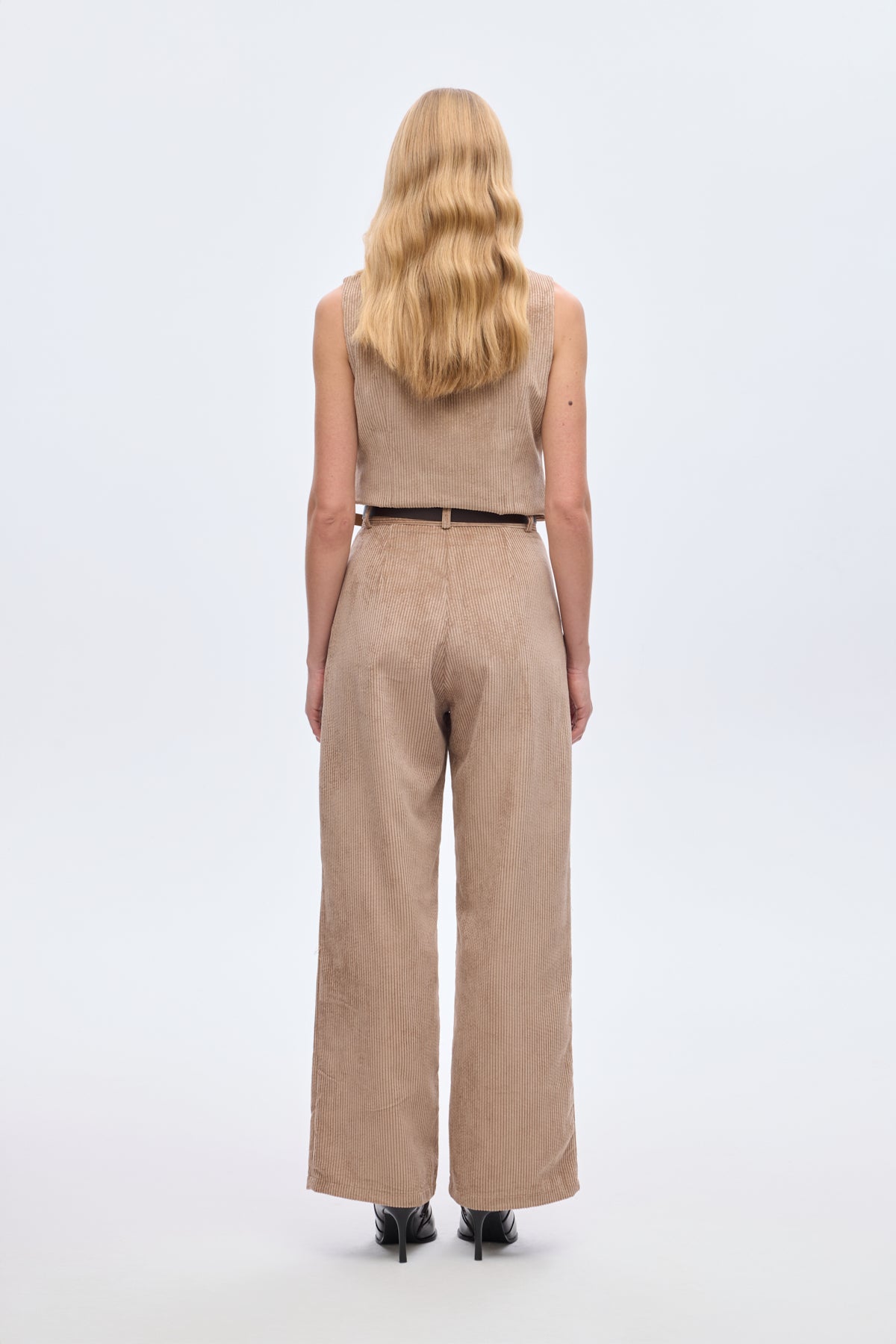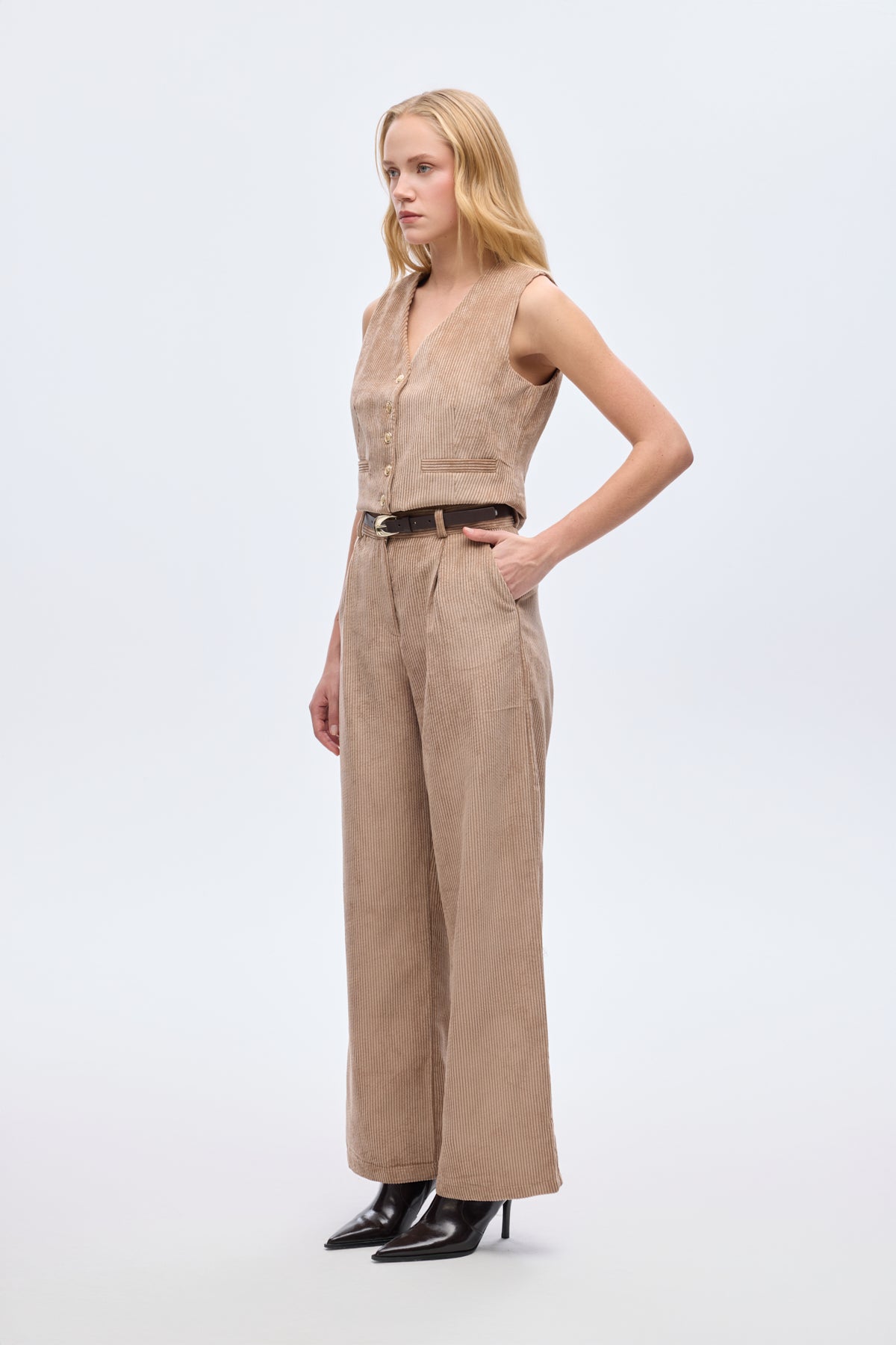 Fitilli kadife dokulu kumaştan, beli kemer detaylı, düz kesim, yüksek bel, yan cepli, önden fermuar ve kanca kapamalı, uzun bol paça pantolon.