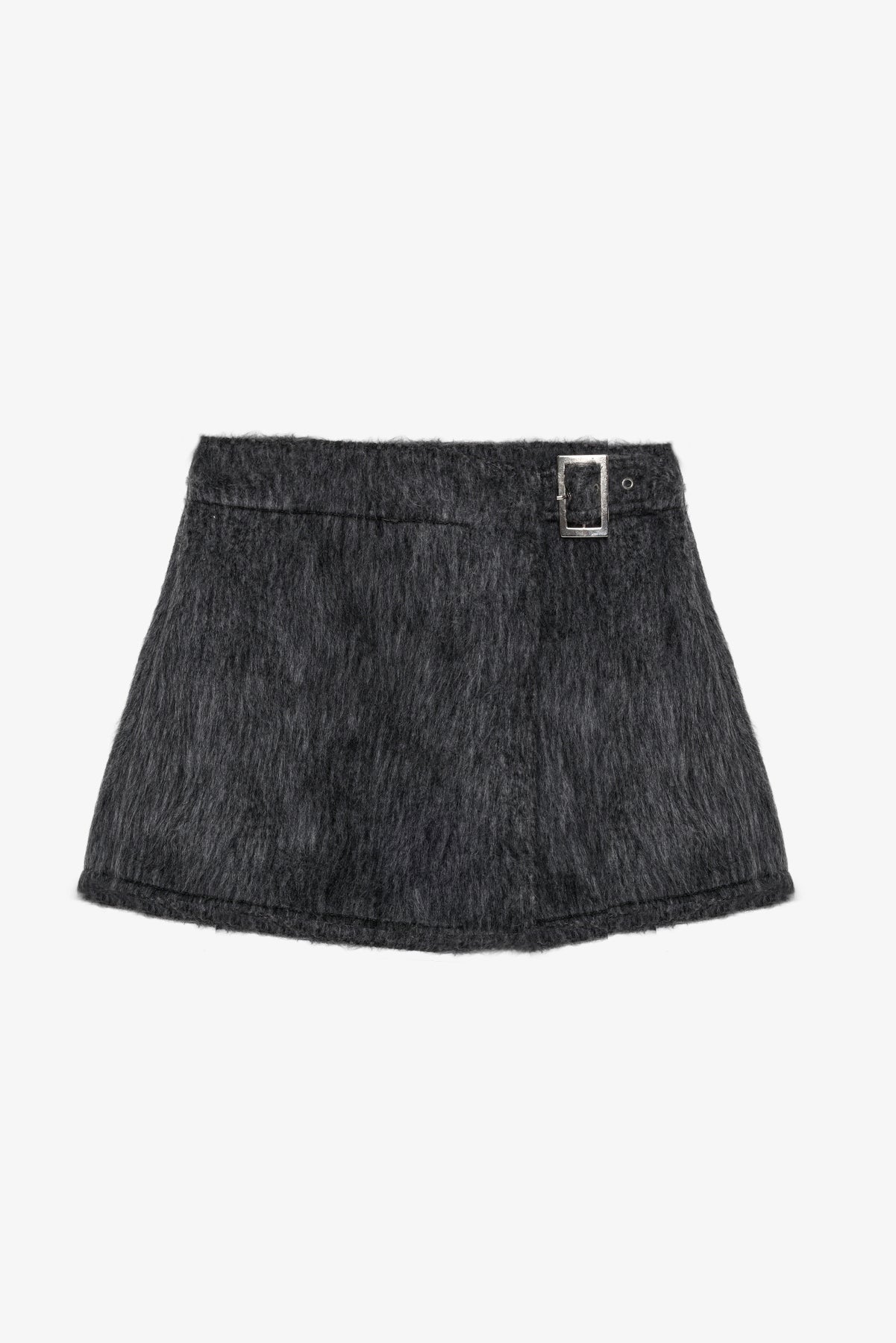 Tüylü dokuda, açılabilen metal tokalı kemer detaylı, içi şortlu kapak görünümde, yandan fermuar kapamalı, mini şort etek.
