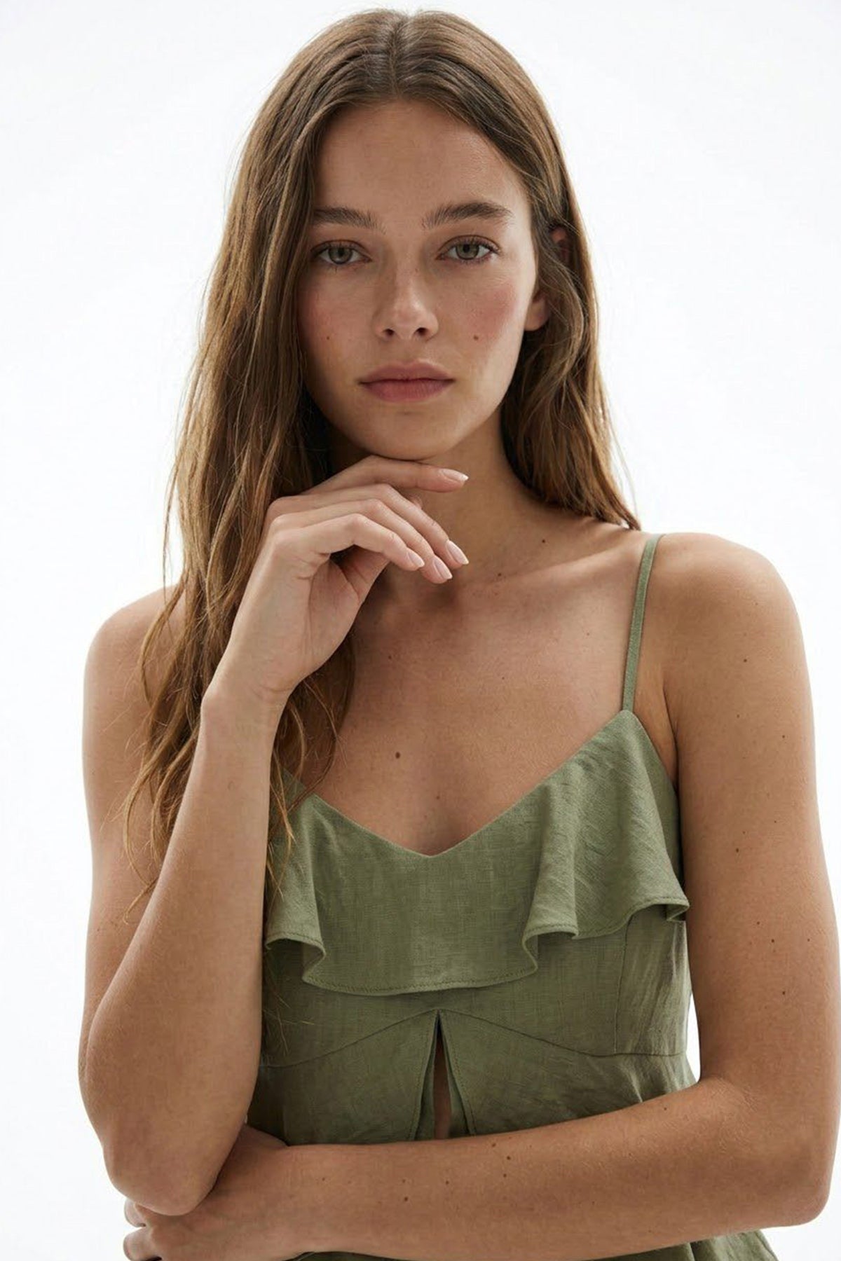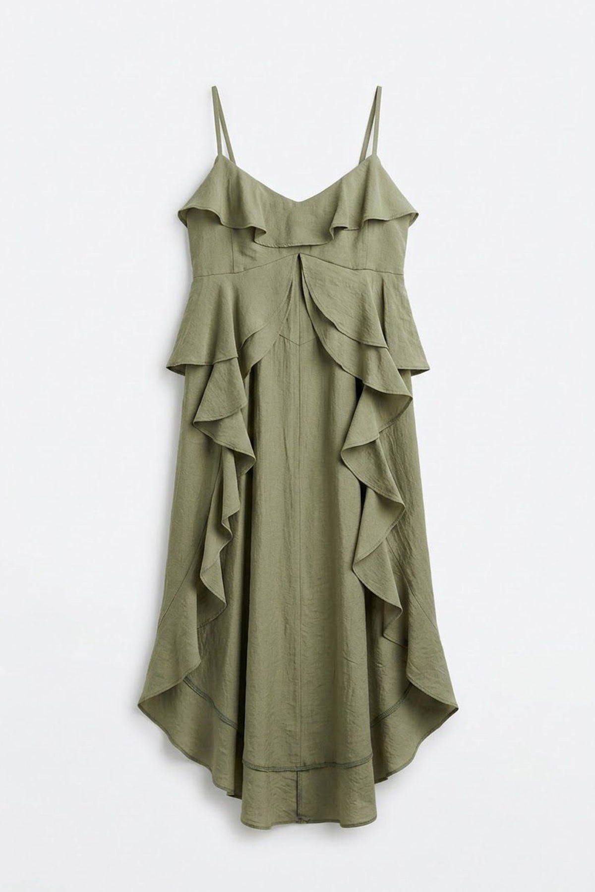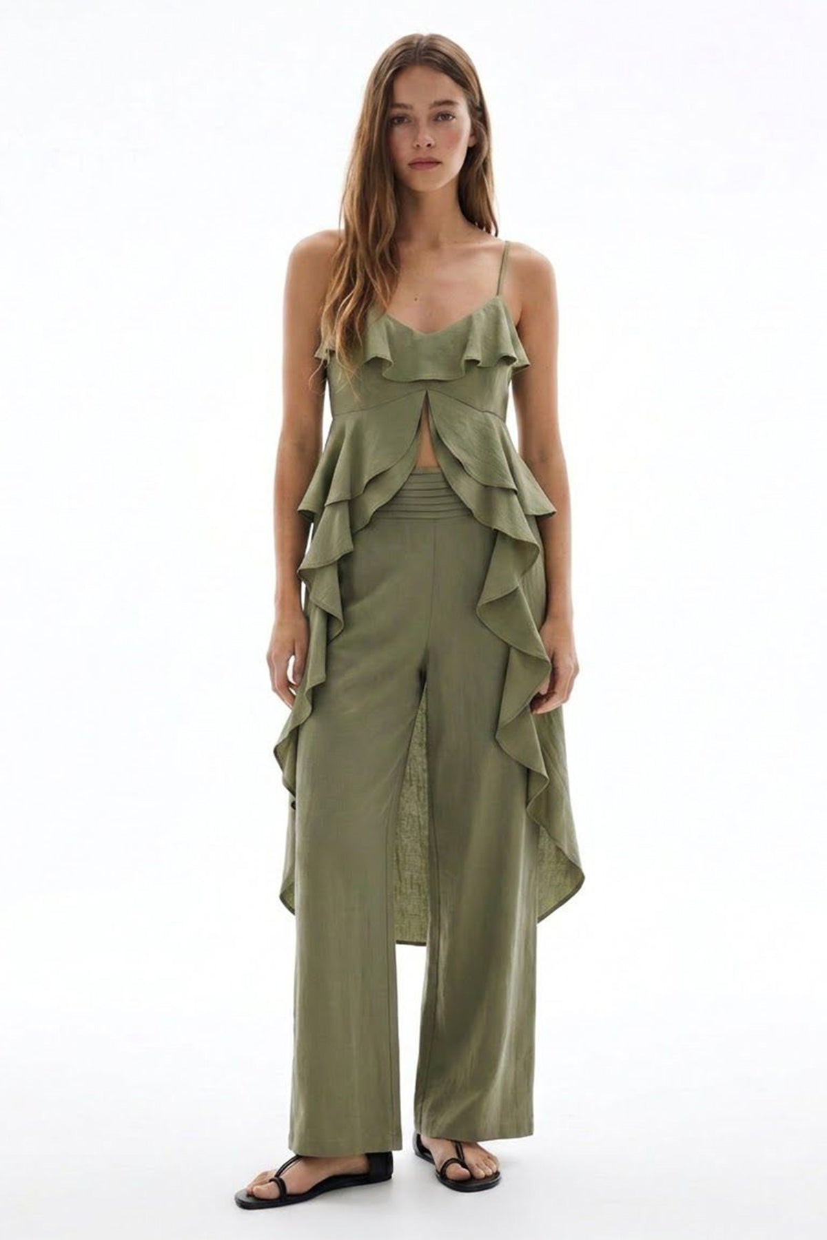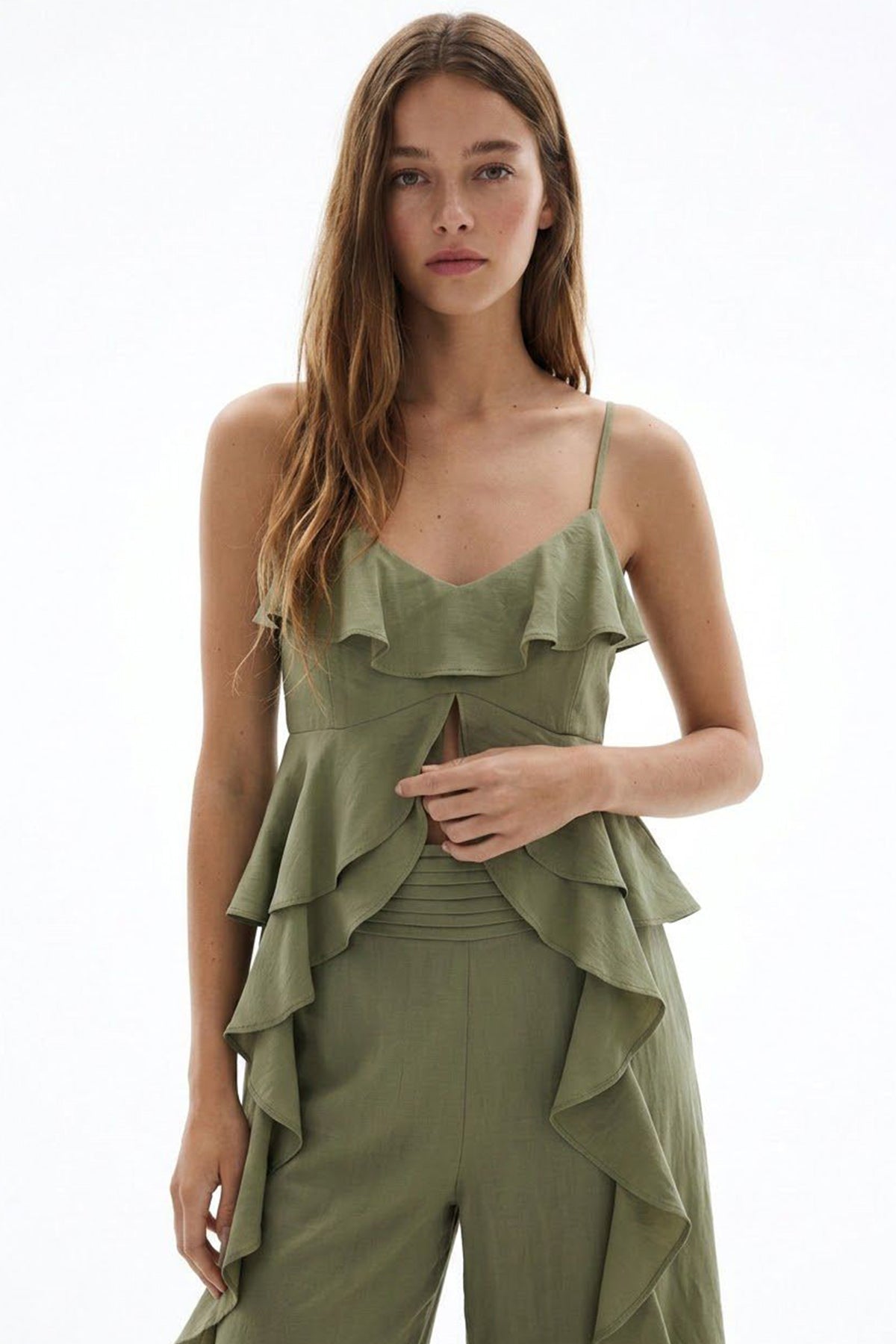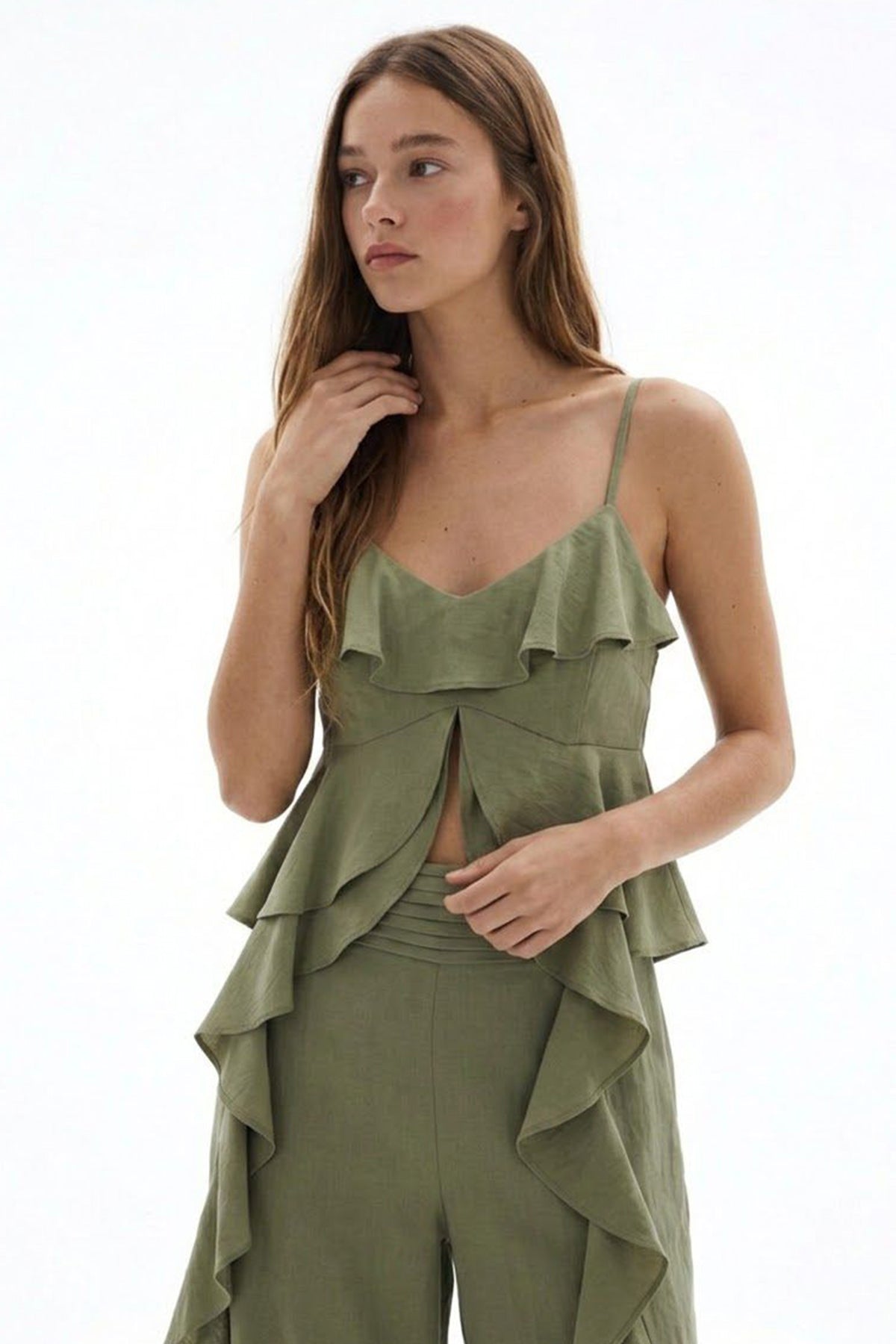 Askılı Volanlı Asimetrik Bluz Haki