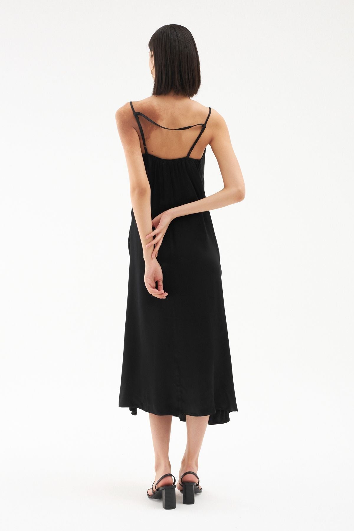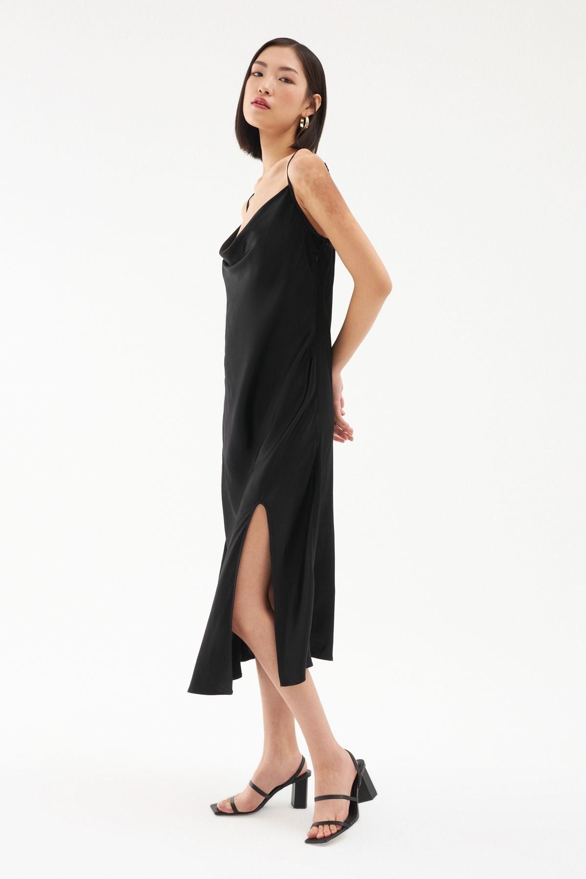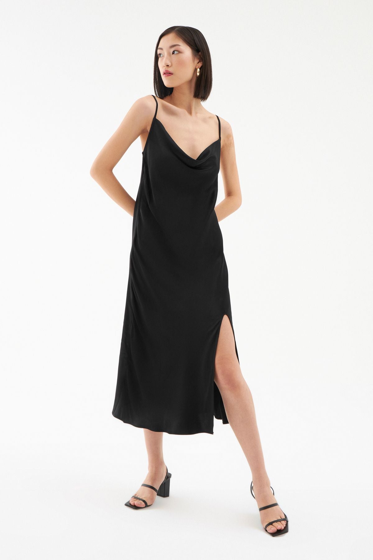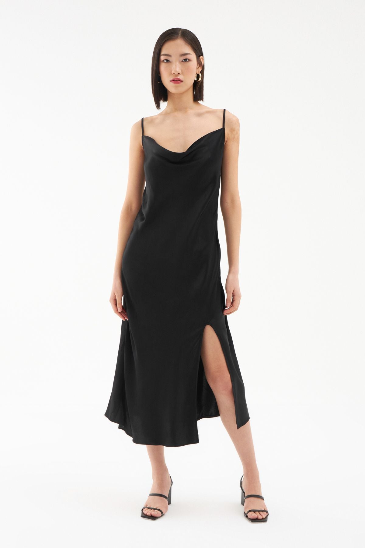Gardırobunda bulunan elbise çeşitliliğine saten görünümlü yırtmaçlı elbise modelini eklemeye ne dersin? İnce askıları ile omuzlarına çekici bir görünüm sunarken bedeni saran hafif yapısı ve degaje yakası ile oldukça iddialı görünüyor. Sırtı lastikli midi boy elbise modelinin ayarlanabilir askı ve gizli fermuar detayları ile elbise koleksiyonumuzda seni bekliyor.