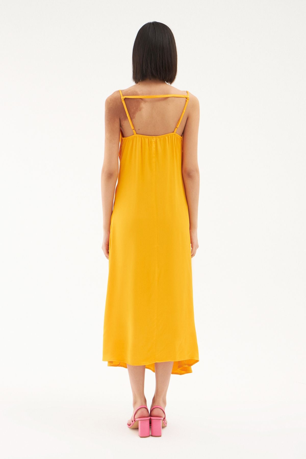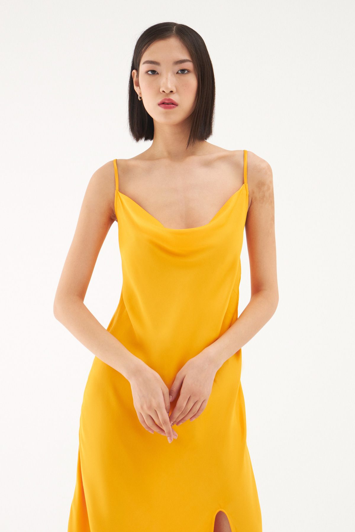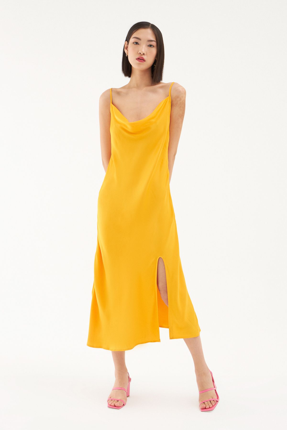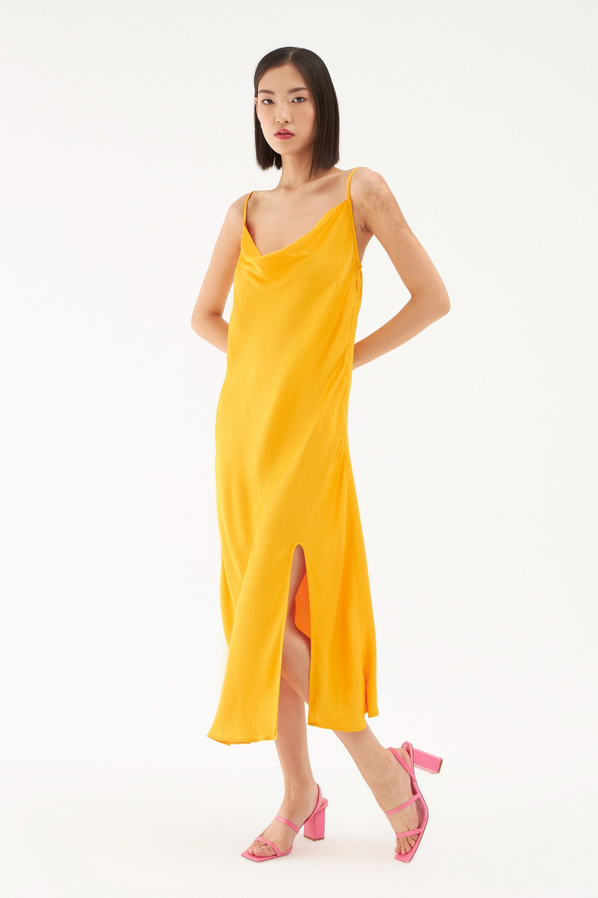Gardırobunda bulunan elbise çeşitliliğine saten görünümlü yırtmaçlı elbise modelini eklemeye ne dersin? İnce askıları ile omuzlarına çekici bir görünüm sunarken bedeni saran hafif yapısı ve degaje yakası ile oldukça iddialı görünüyor. Sırtı lastikli midi boy elbise modelinin ayarlanabilir askı ve gizli fermuar detayları ile elbise koleksiyonumuzda seni bekliyor.