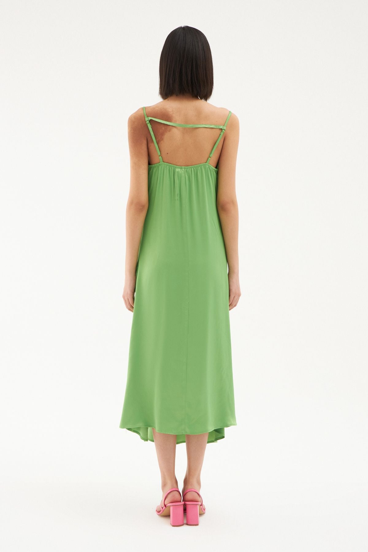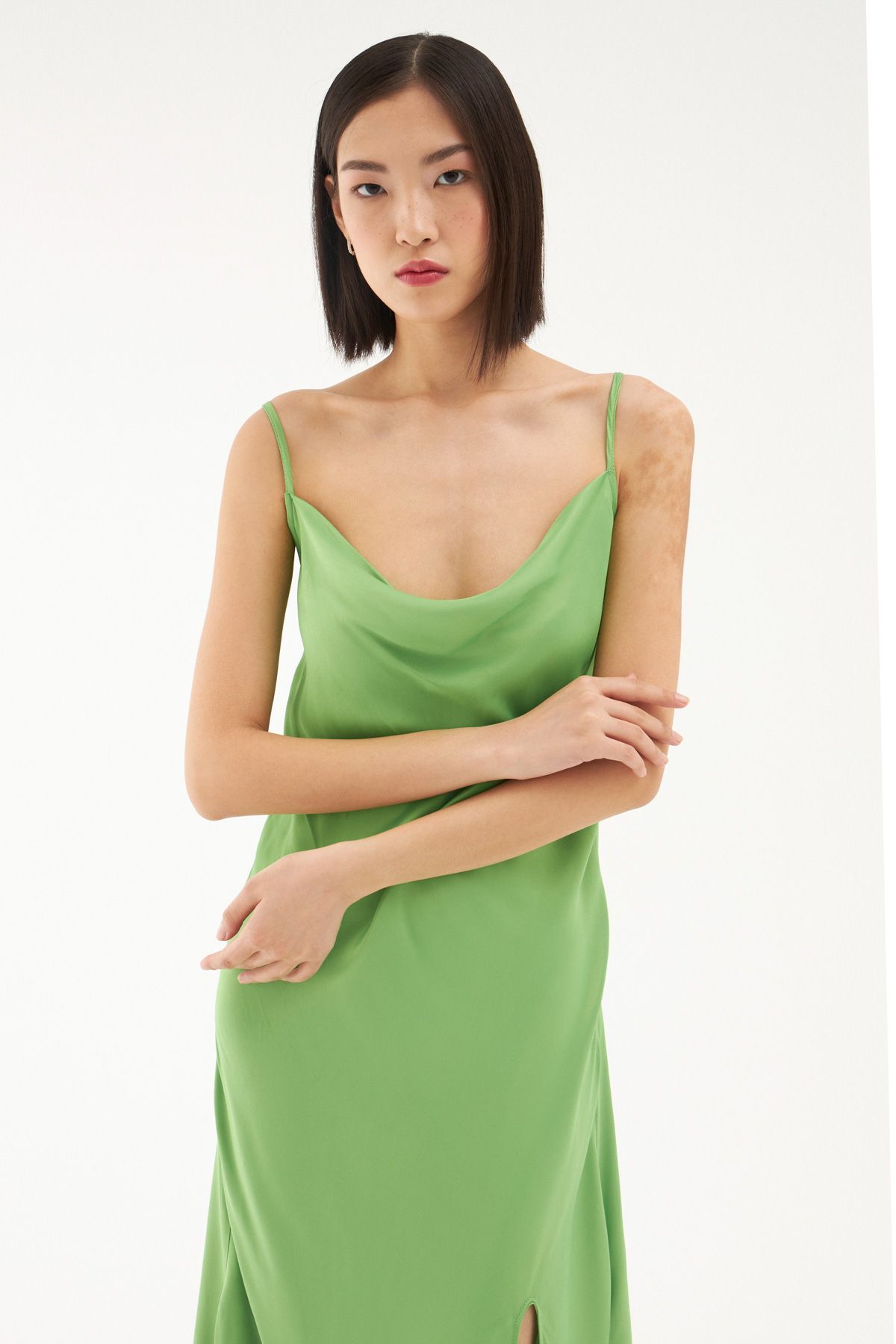 Gardırobunda bulunan elbise çeşitliliğine saten görünümlü yırtmaçlı elbise modelini eklemeye ne dersin? İnce askıları ile omuzlarına çekici bir görünüm sunarken bedeni saran hafif yapısı ve degaje yakası ile oldukça iddialı görünüyor. Sırtı lastikli midi boy elbise modelinin ayarlanabilir askı ve gizli fermuar detayları ile elbise koleksiyonumuzda seni bekliyor.
