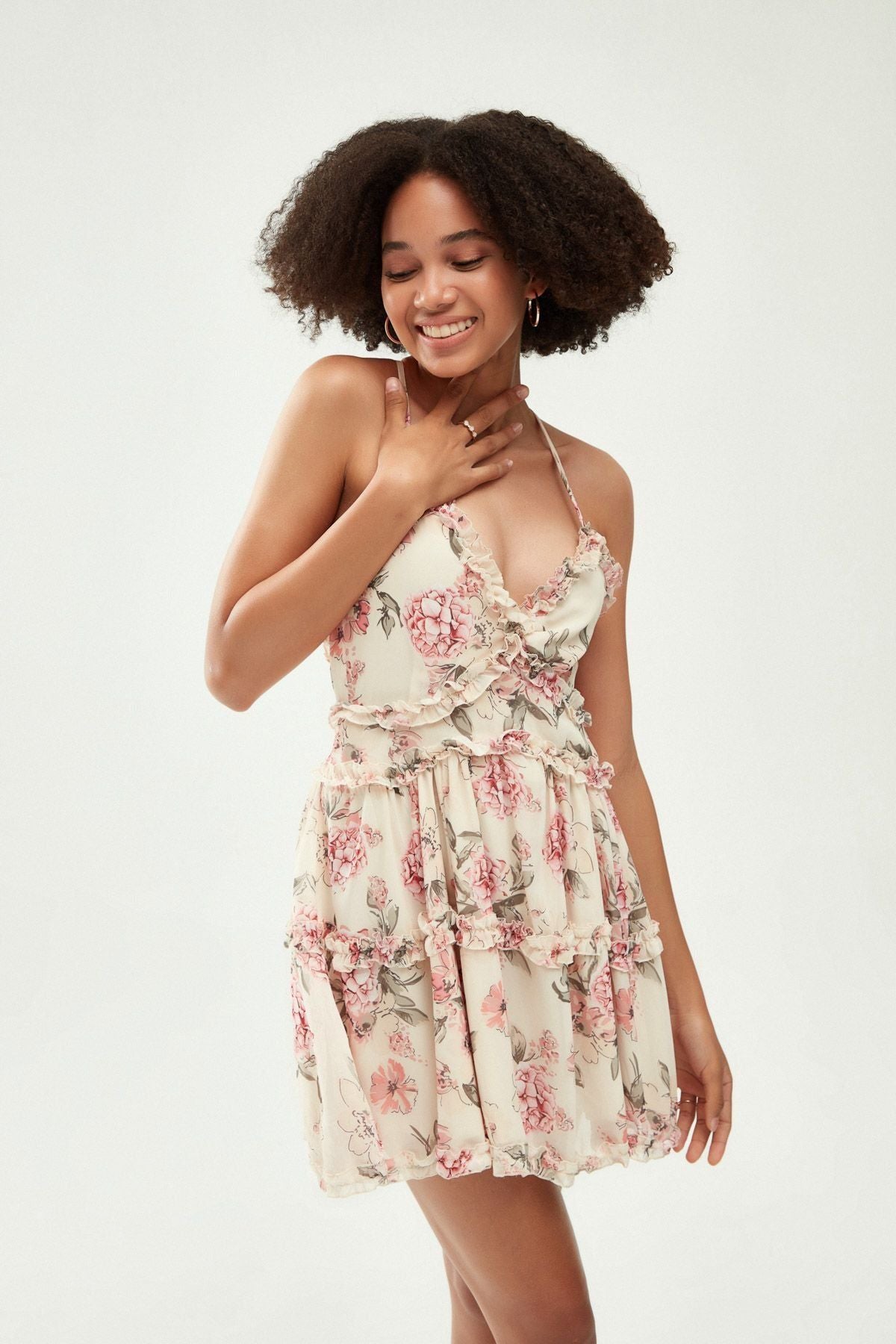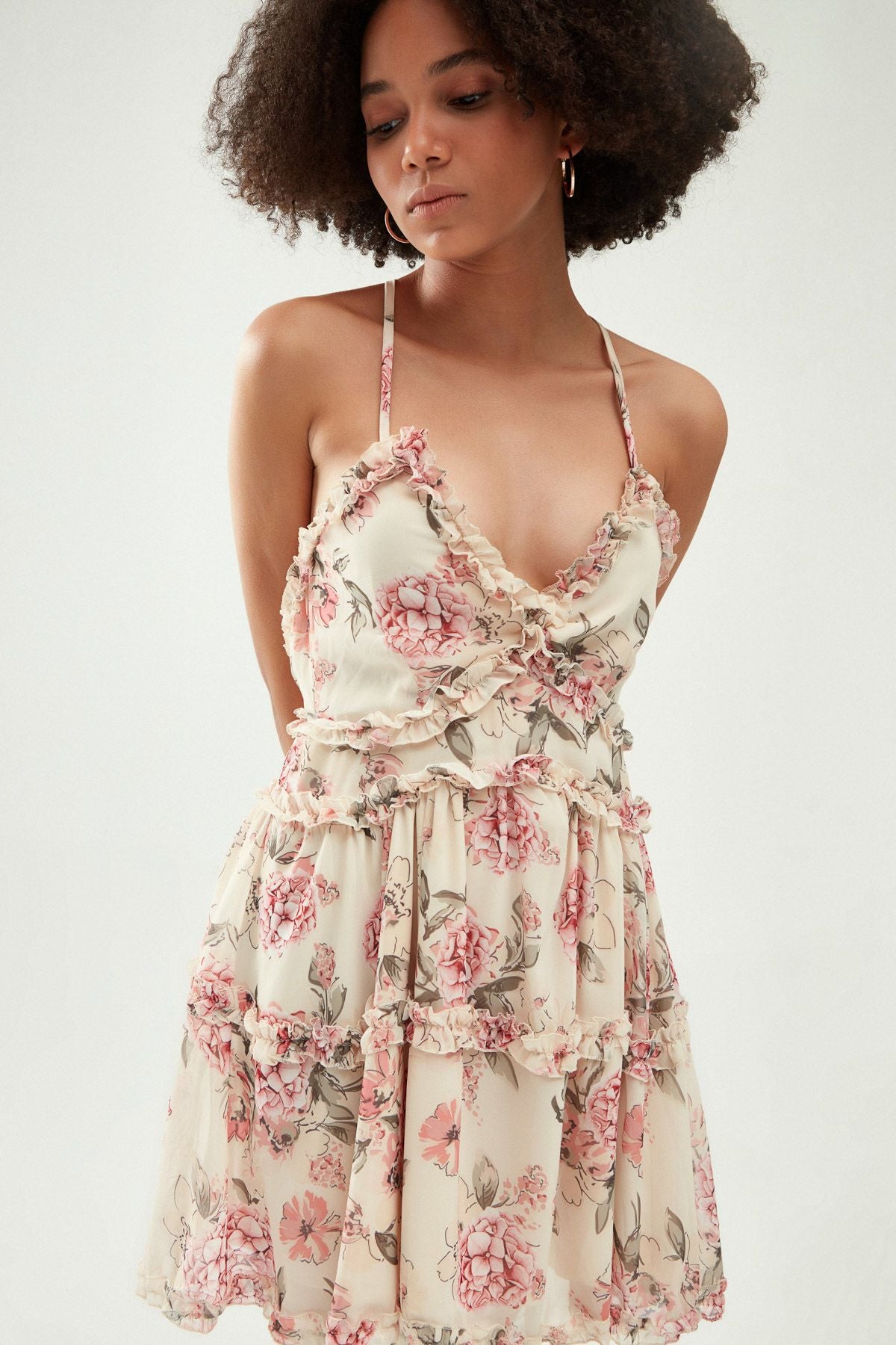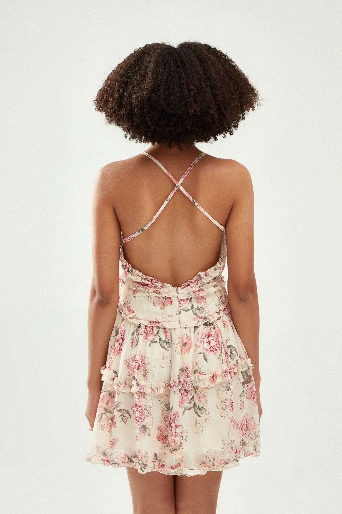 Sırt kısmı çapraz askı detayı olan desenli mini elbise, fırfır detaylıdır. Arka kısmında gizli fermuar bulunmaktadır.
