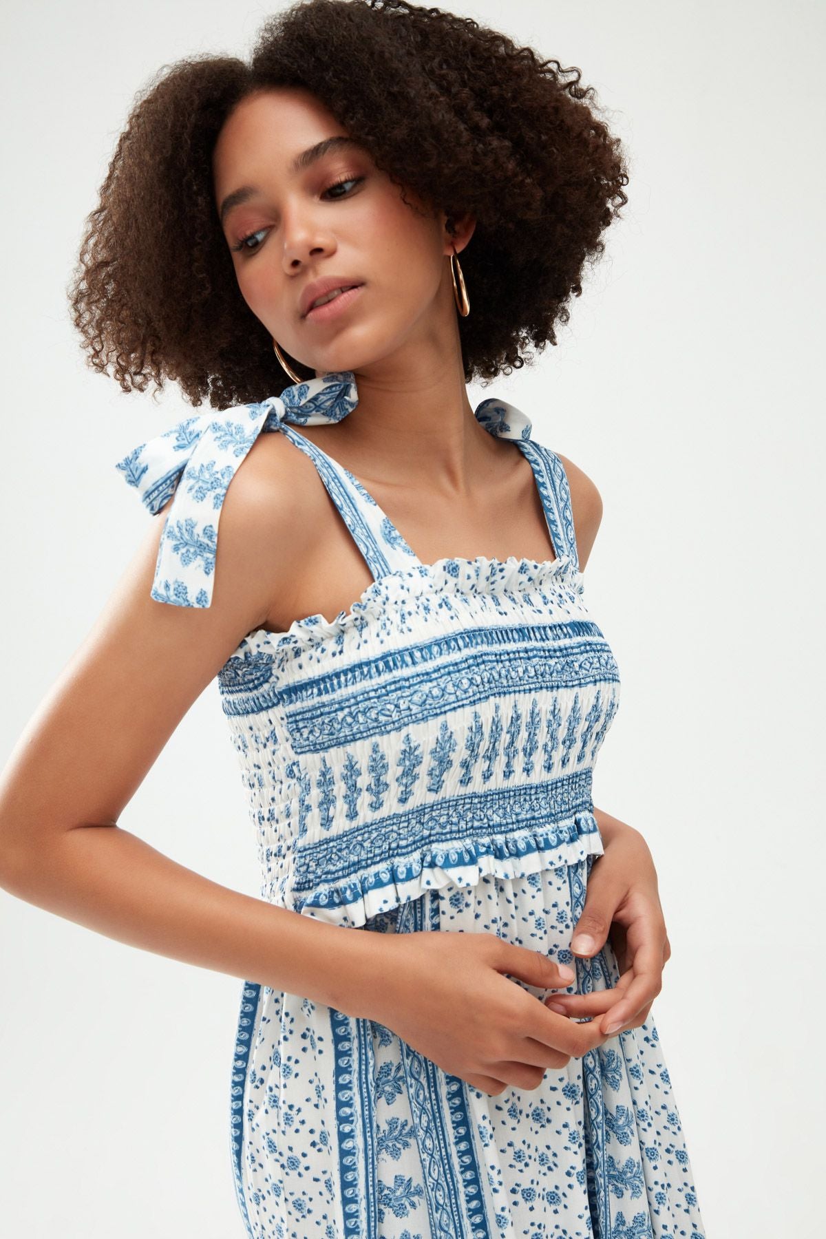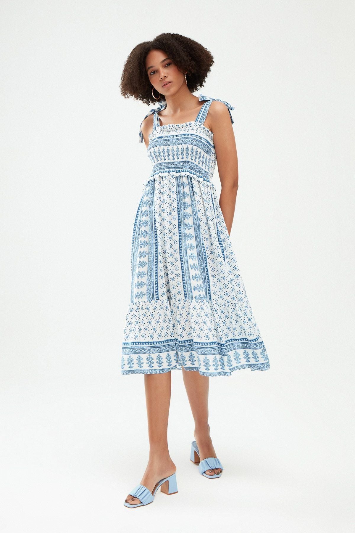 Desenli Gipeli Kalın Askılı Elbise Mavi
