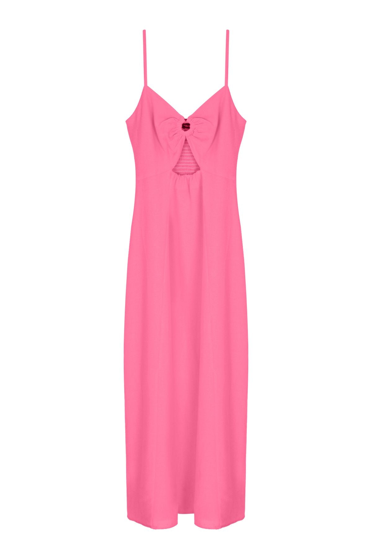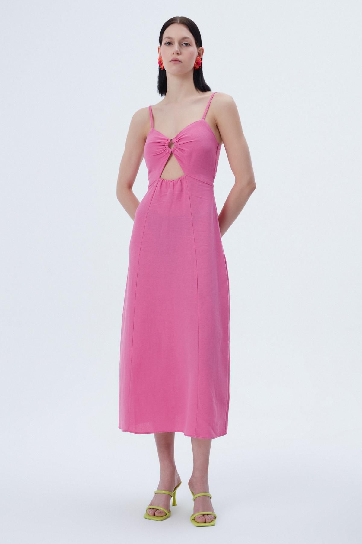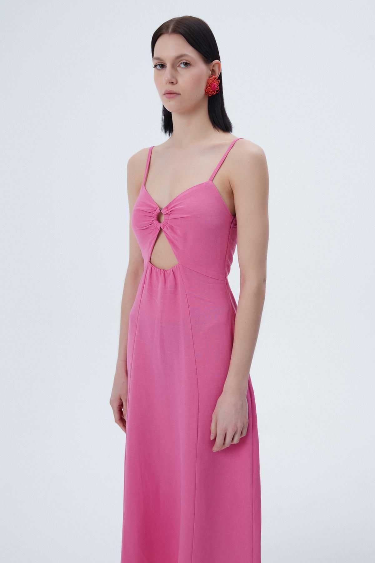Göğüs Dekolteli Askılı Uzun Elbise Pembe