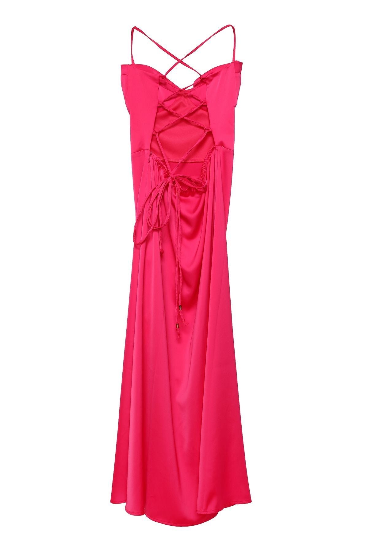 Sırtı Bağlamalı Straplez Saten Elbise Fuşya