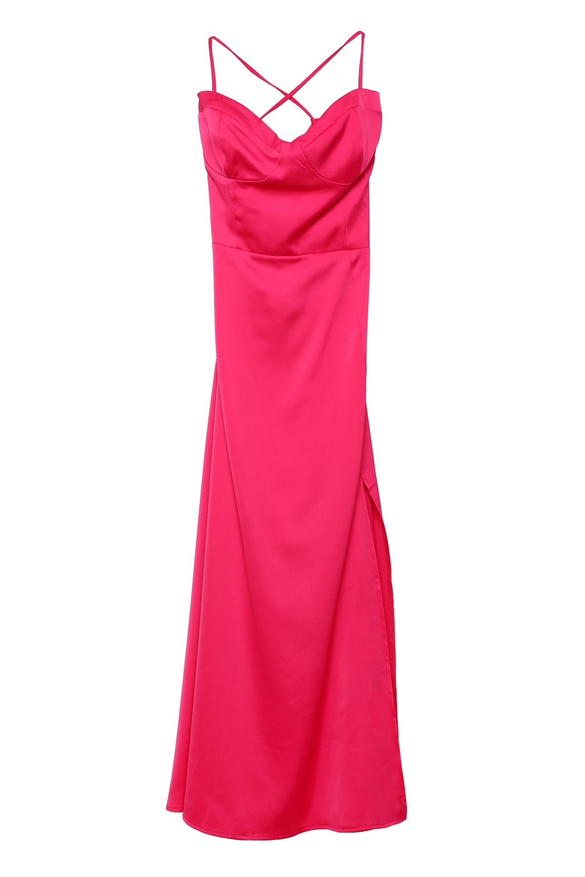%97 Pamuk,%3 Elastan, straplez, sırtı ip bağlamalı, yandan gizli fermuarlı, önden yırtmaçlı, saten midi elbise.