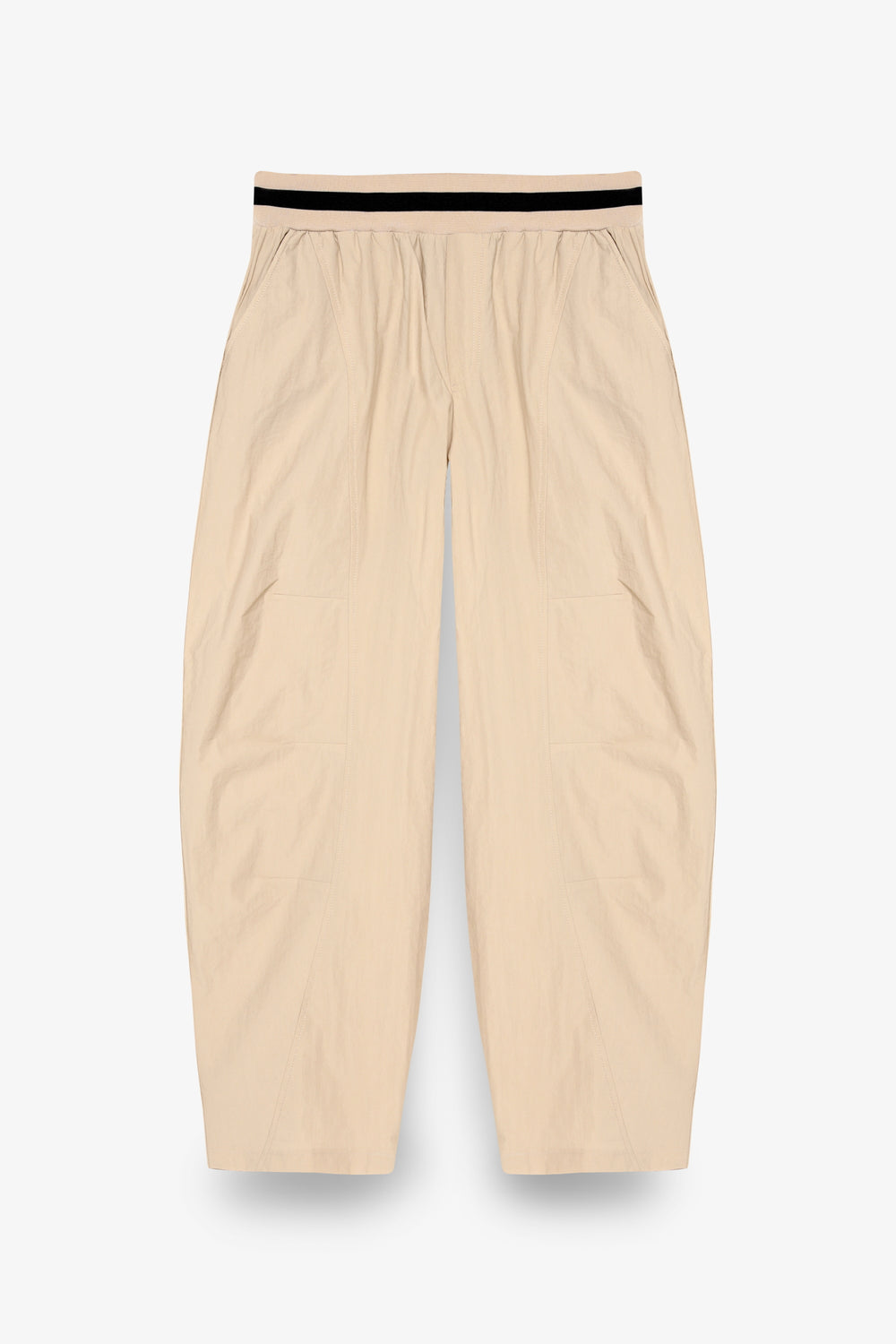Beli ribana lastikli, önü dikiş şerit detaylı, parüşüt kumaş, cep detaylı, yüksek bel, kapamasız, bol paça pantolon.