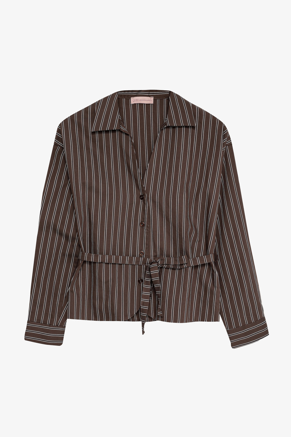 Çizgili Bağlamalı V Yaka Gömlek Kahverengi