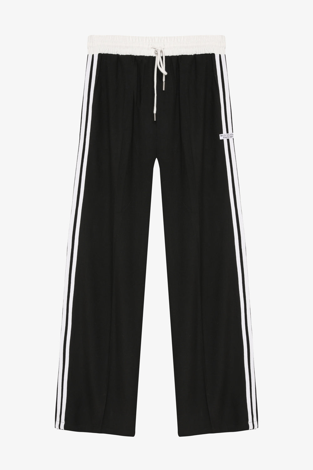 Etiket Detaylı Şerit Garnili Bol Paça Pantolon Siyah